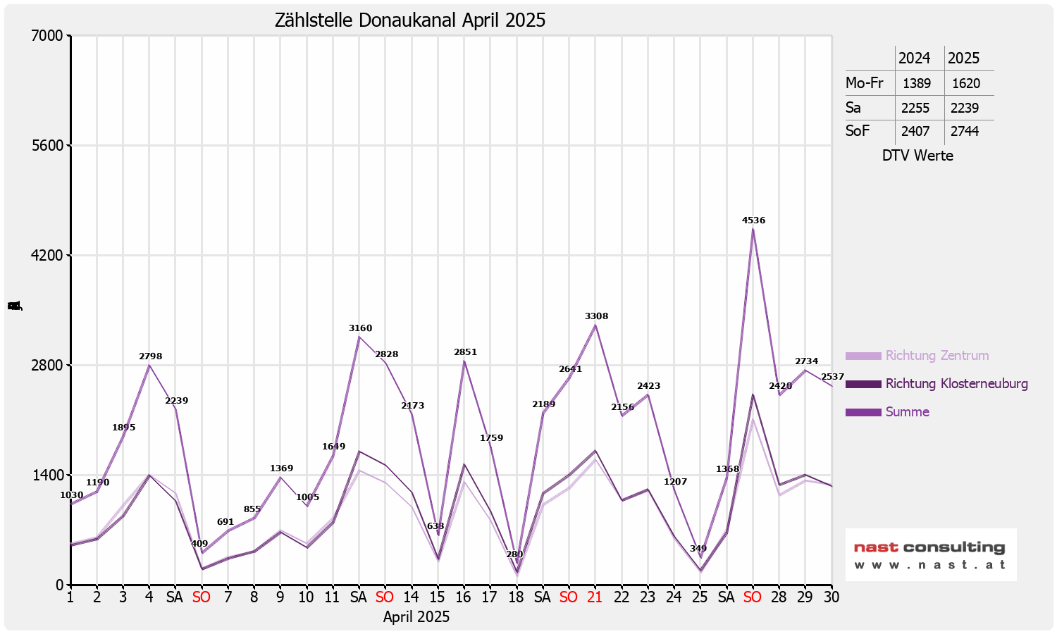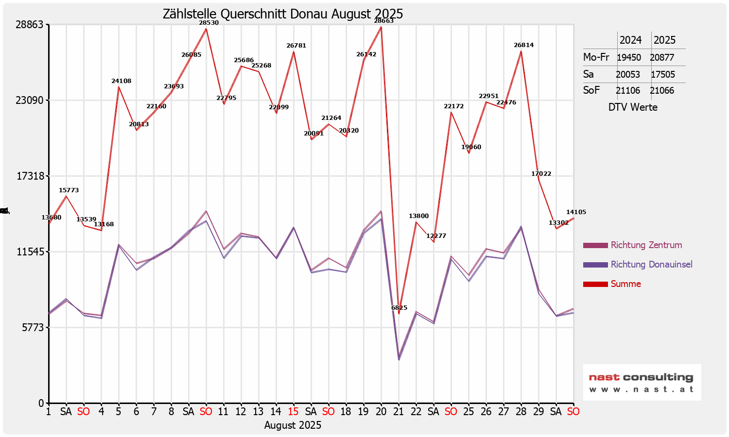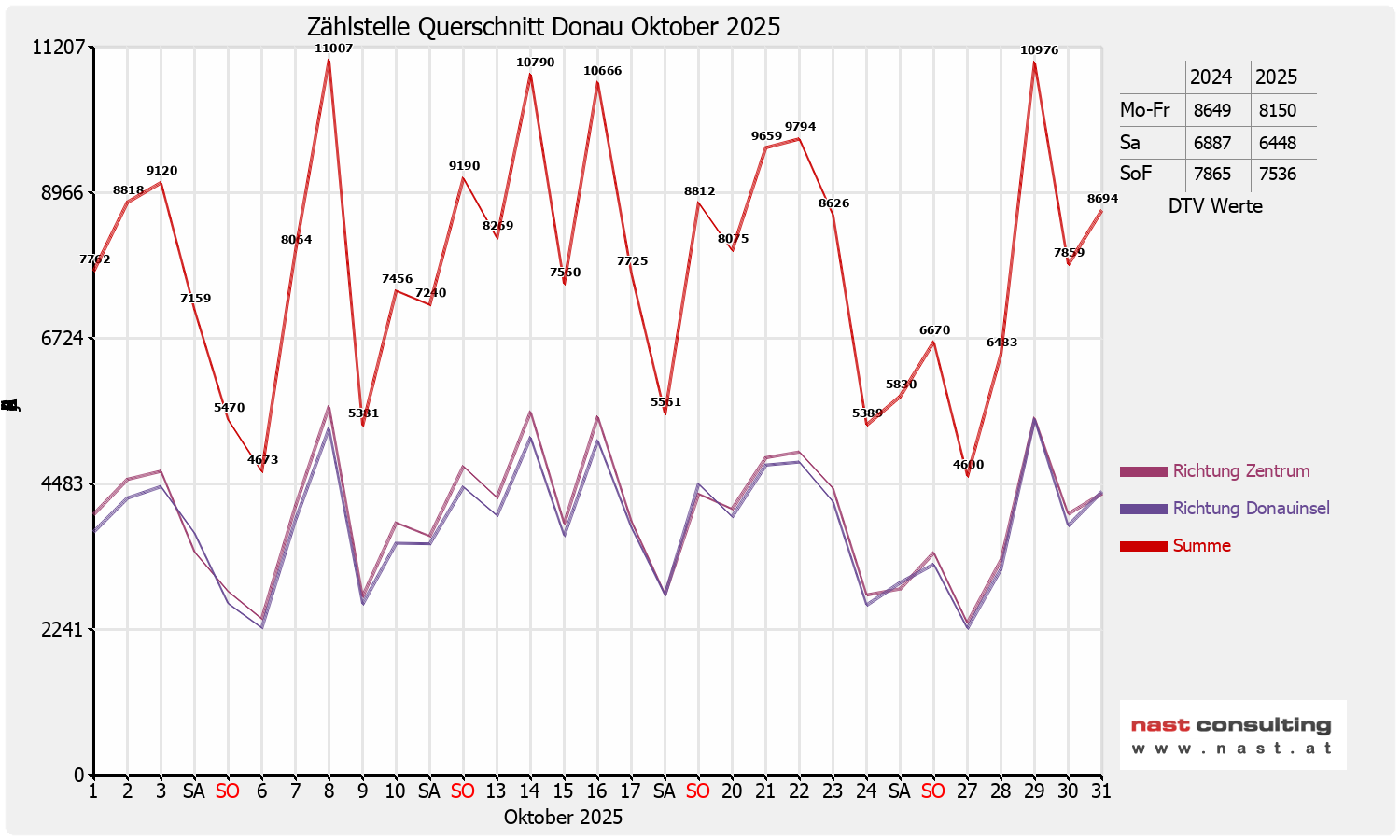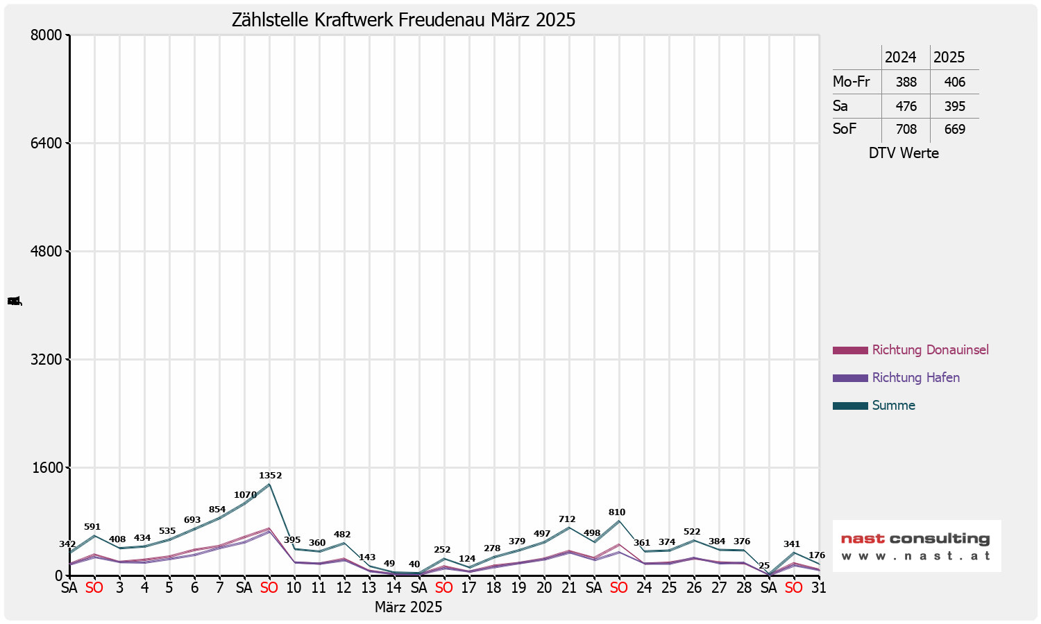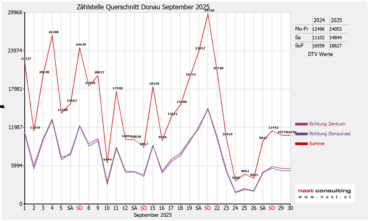 Im „Querschnitt Donau“ sind die Zählstellen Steinitzsteg, Friedrich-Engels-Platz, Maria-Resituta-Platz, Lassallestraße, Praterbrücke, Kraftwerk Freudenau inkludiert.