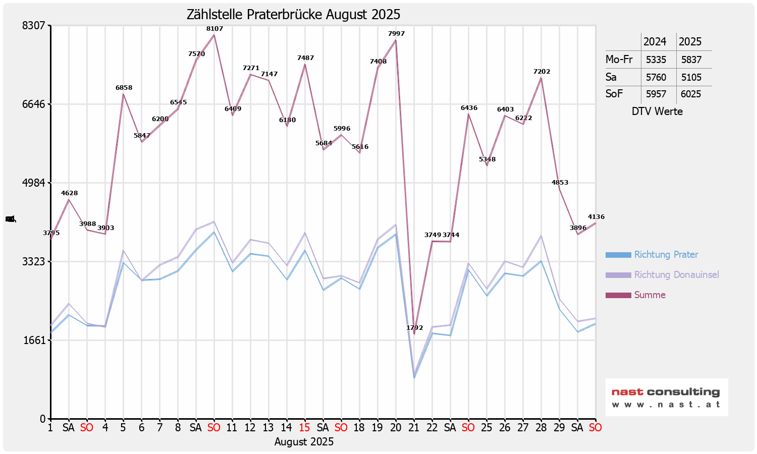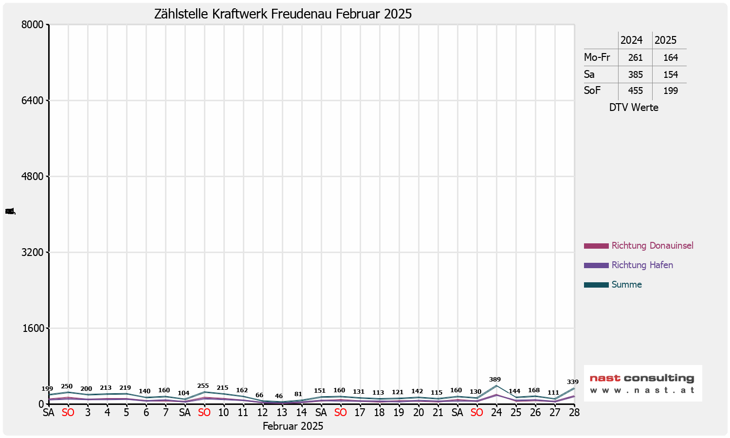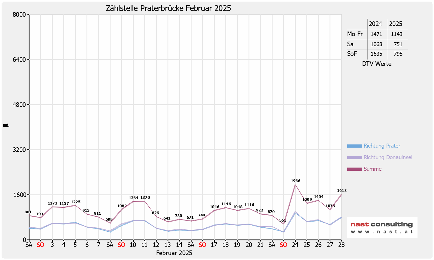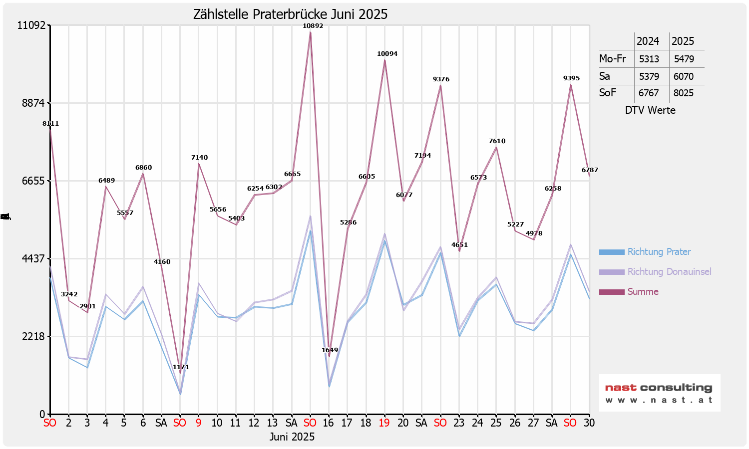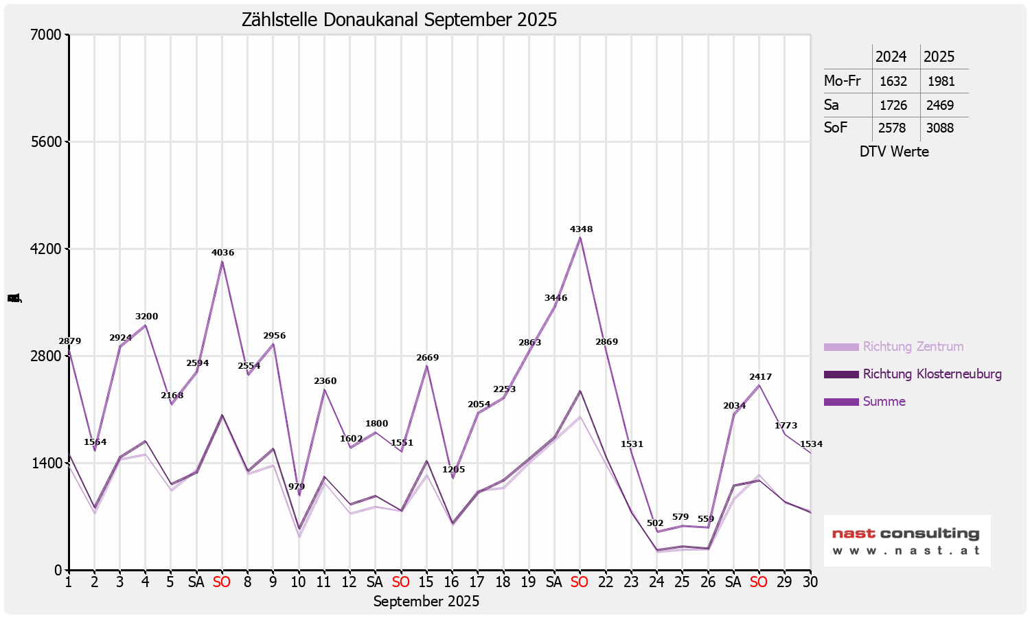 Im „Querschnitt Donau“ sind die Zählstellen Steinitzsteg, Friedrich-Engels-Platz, Maria-Resituta-Platz, Lassallestraße, Praterbrücke, Kraftwerk Freudenau inkludiert.