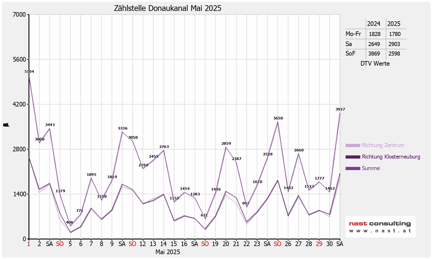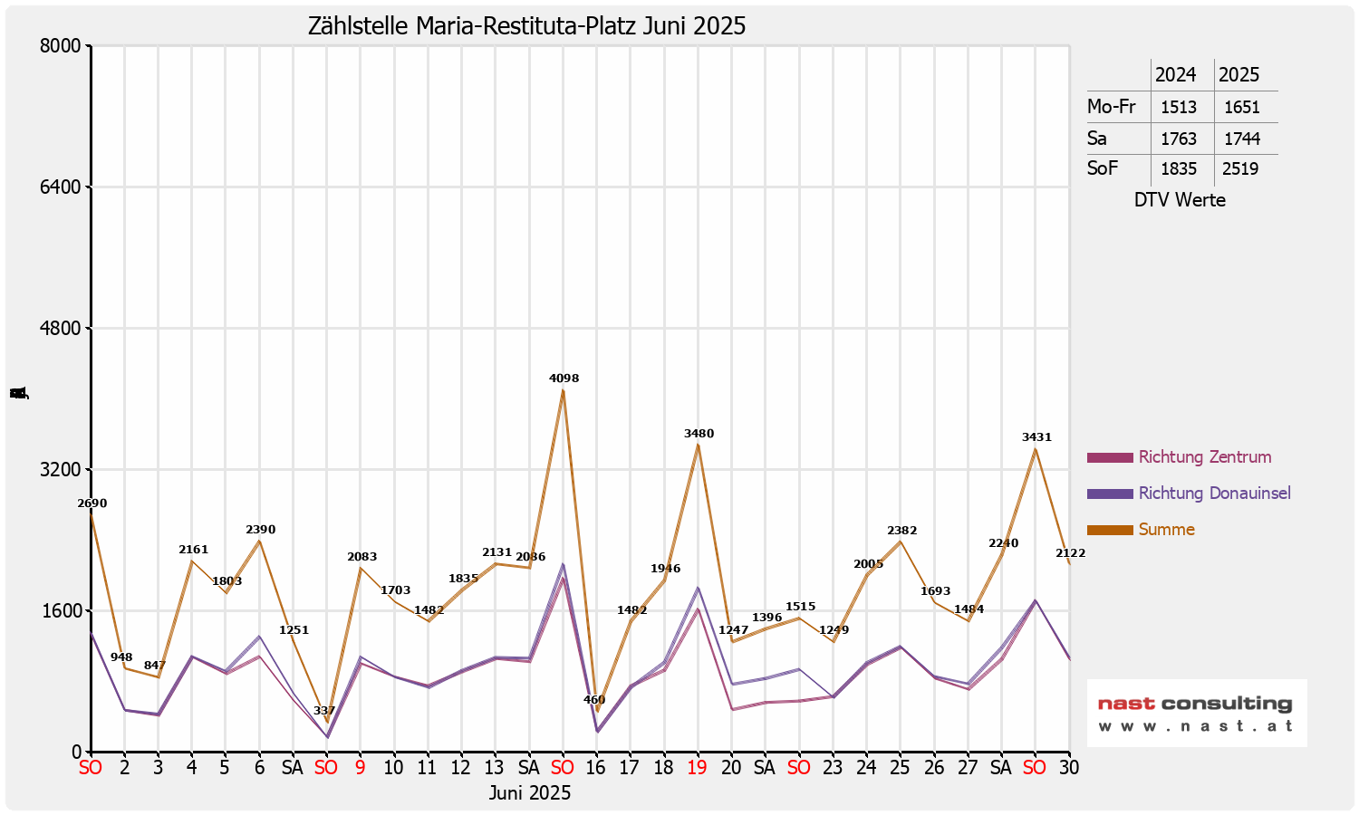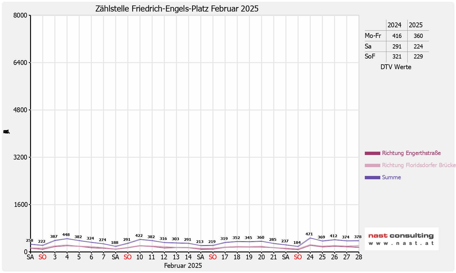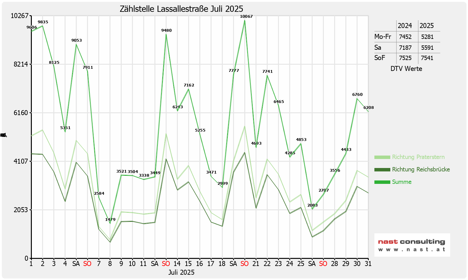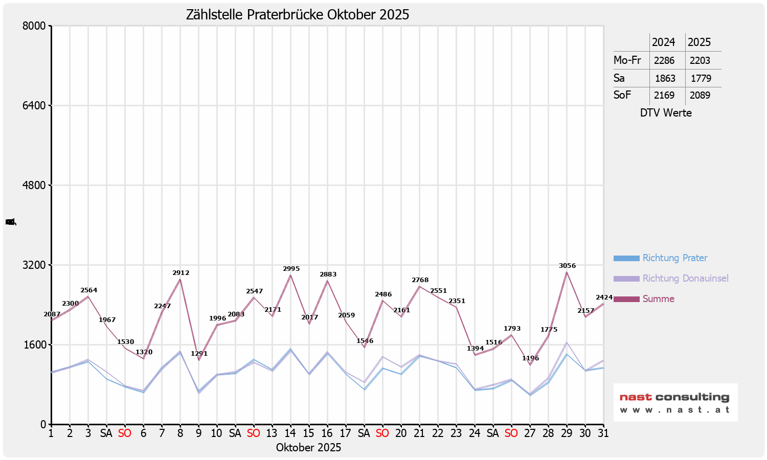 Im „Querschnitt Donau“ sind die Zählstellen Steinitzsteg, Friedrich-Engels-Platz, Maria-Resituta-Platz, Lassallestraße, Praterbrücke, Kraftwerk Freudenau inkludiert.