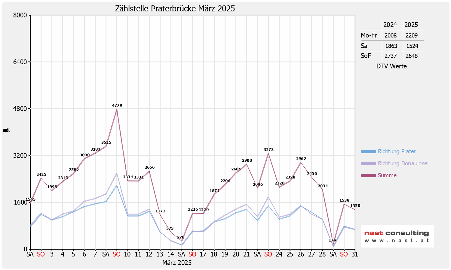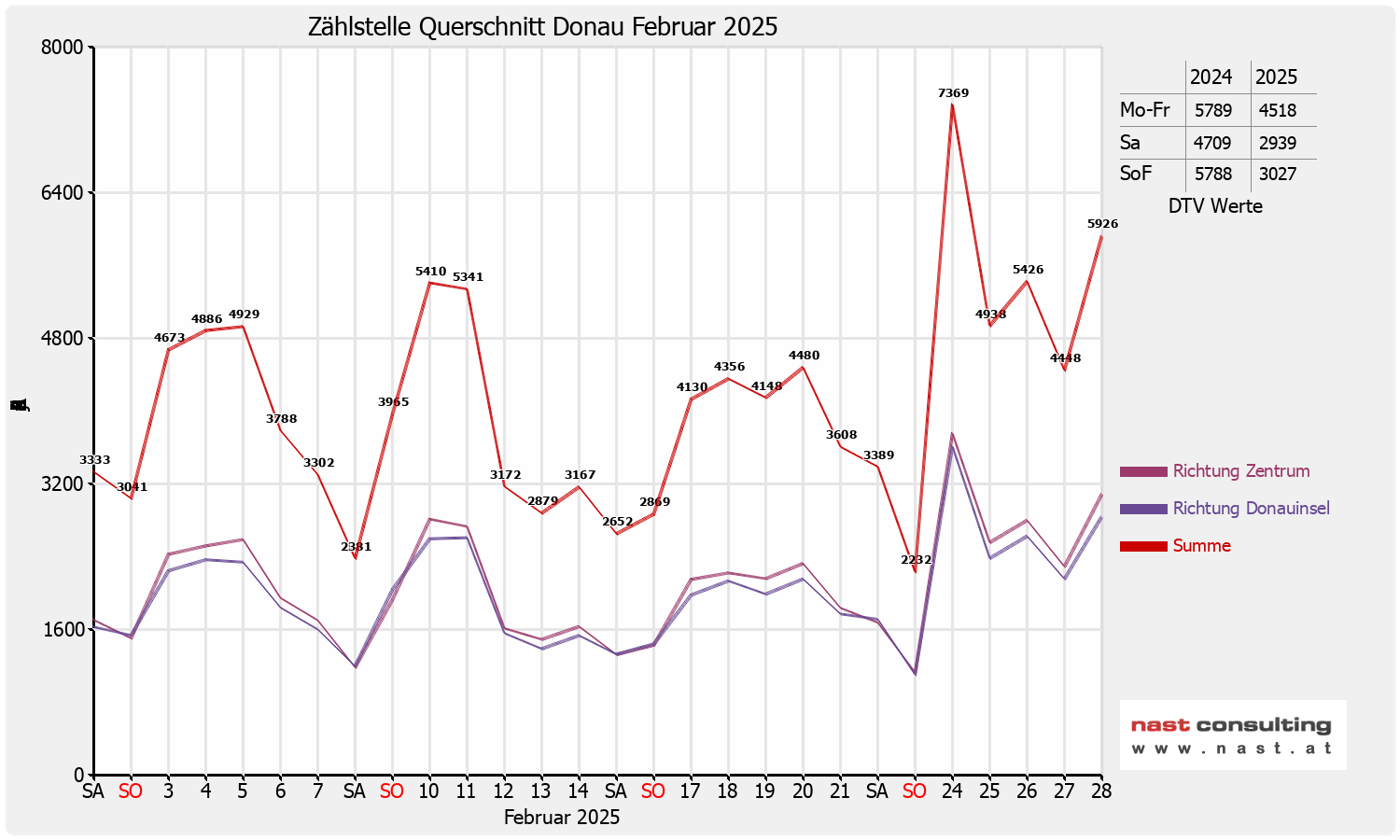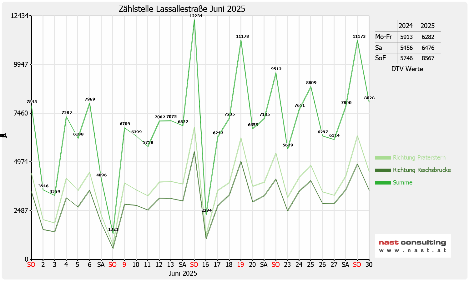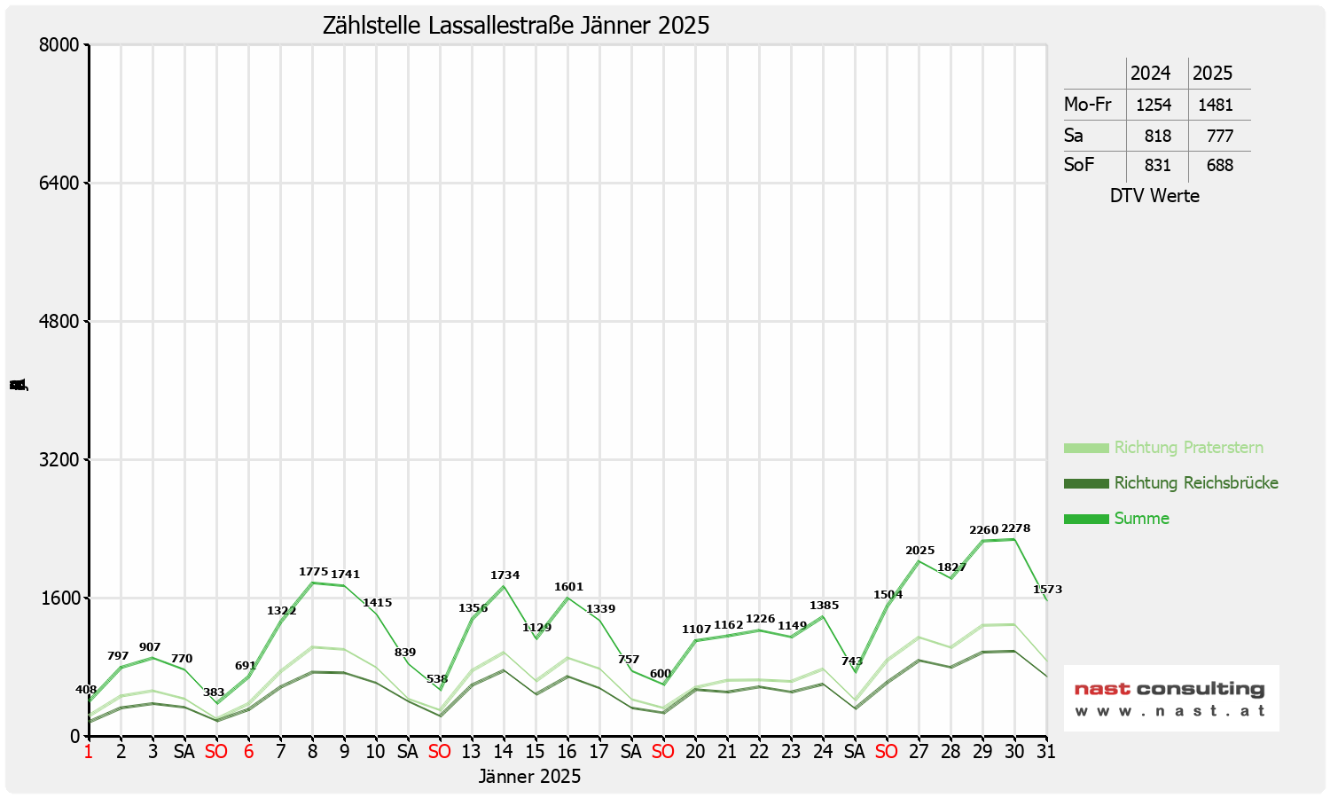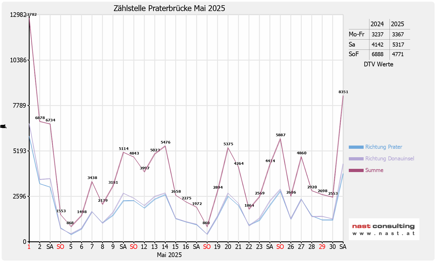 Im „Querschnitt Donau“ sind die Zählstellen Steinitzsteg, Friedrich-Engels-Platz, Maria-Resituta-Platz, Lassallestraße, Praterbrücke, Kraftwerk Freudenau inkludiert.