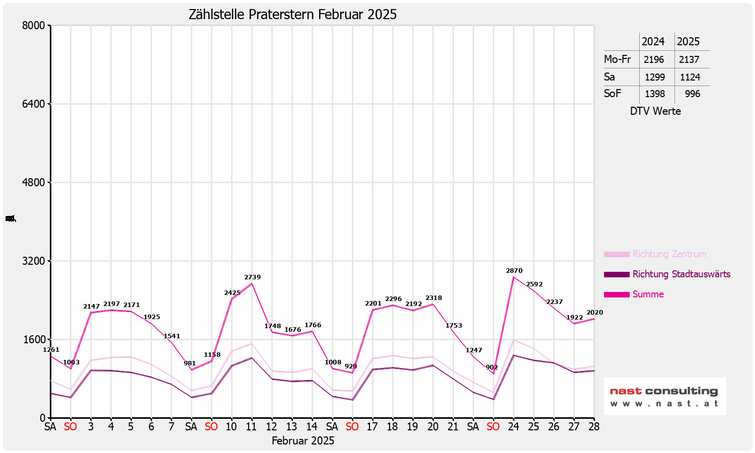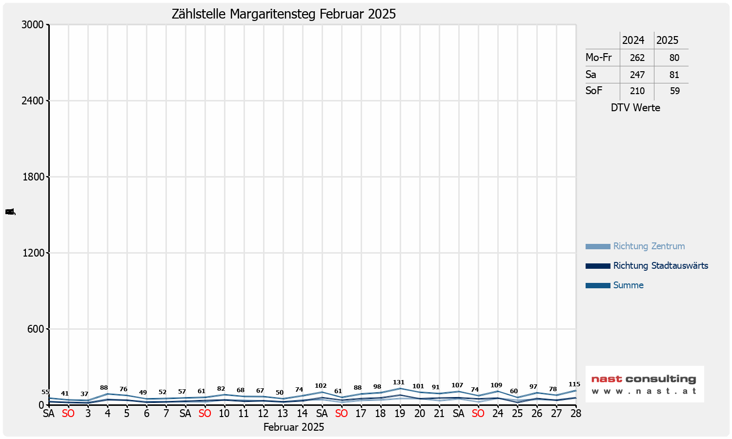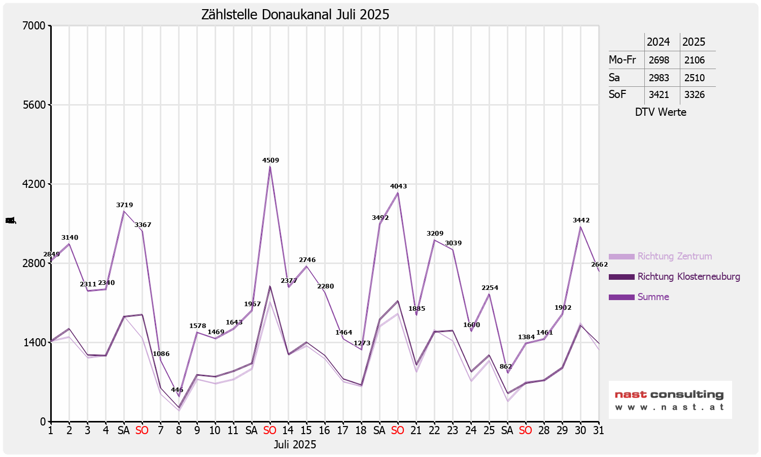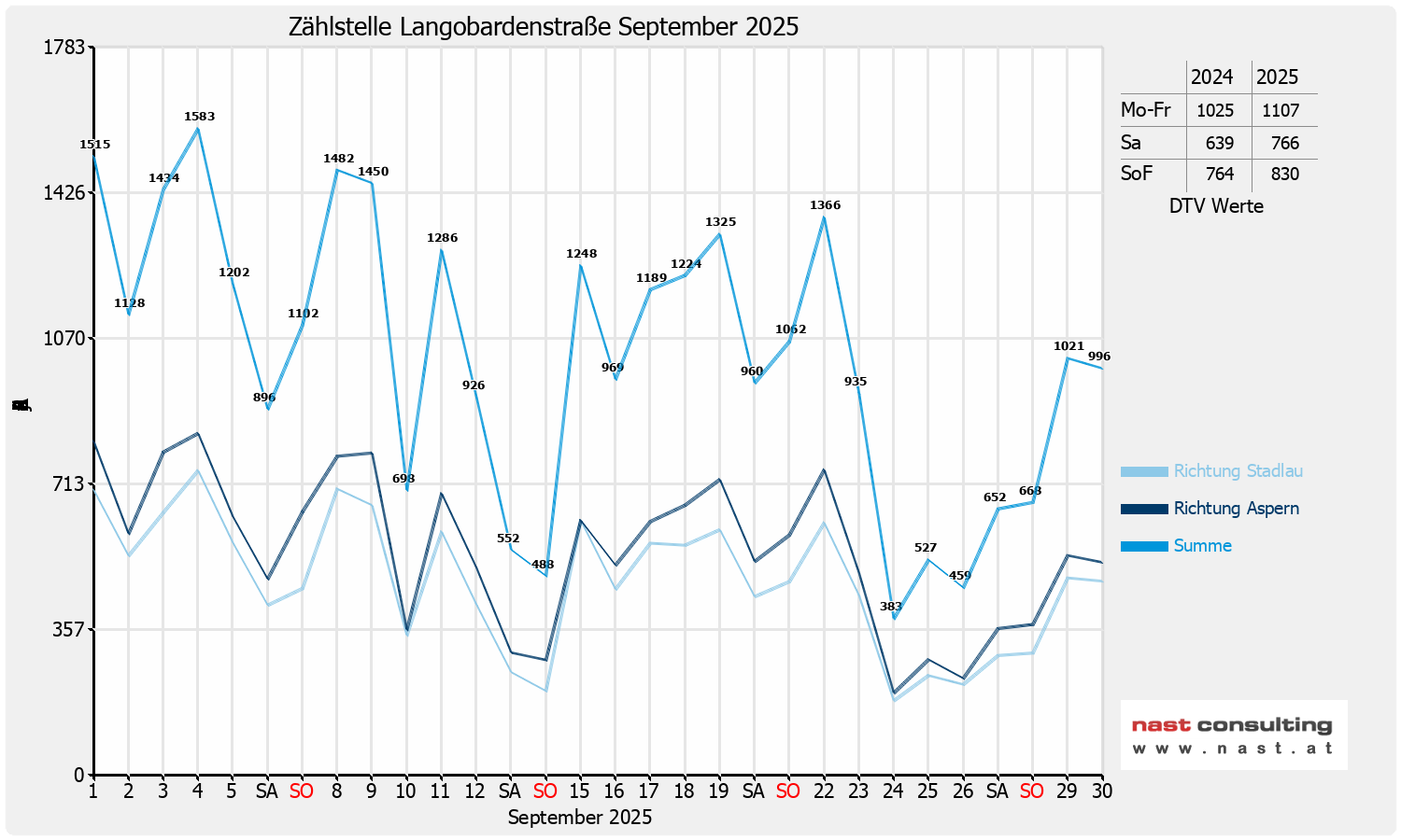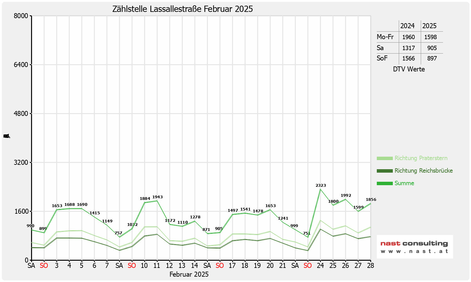 Im „Querschnitt Donau“ sind die Zählstellen Steinitzsteg, Friedrich-Engels-Platz, Maria-Resituta-Platz, Lassallestraße, Praterbrücke, Kraftwerk Freudenau inkludiert.