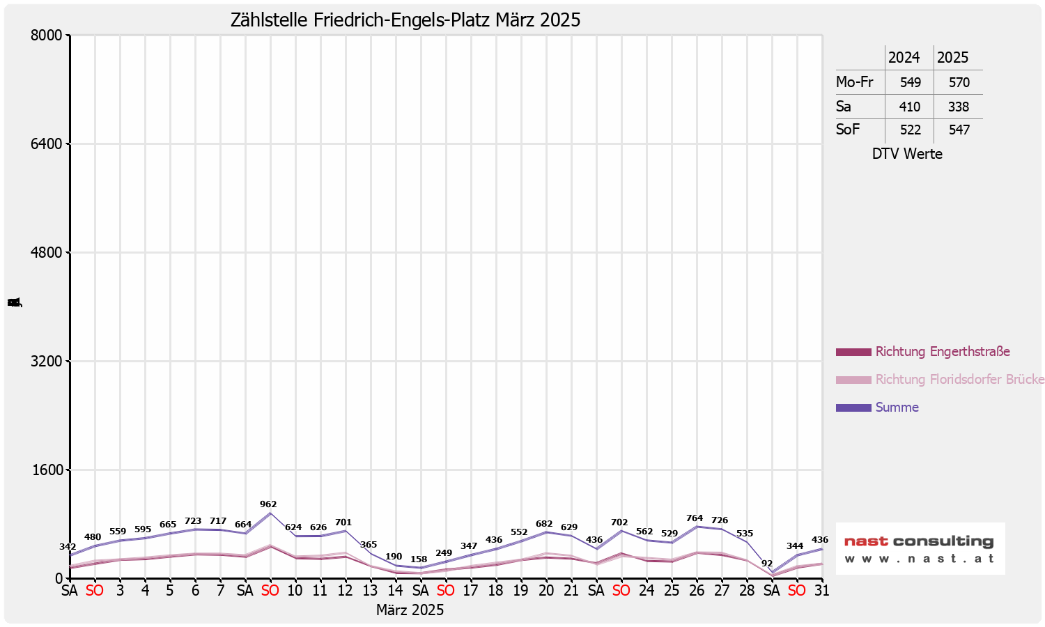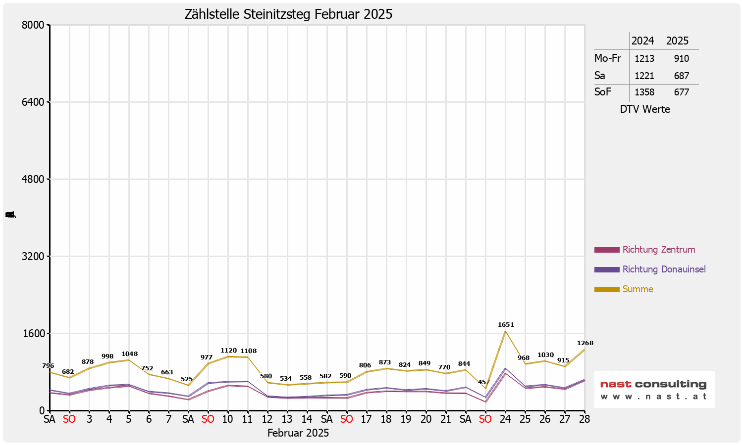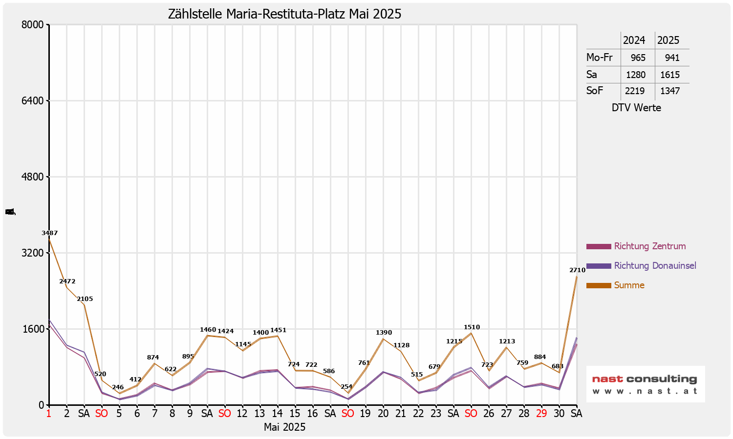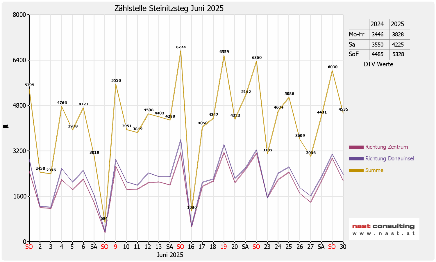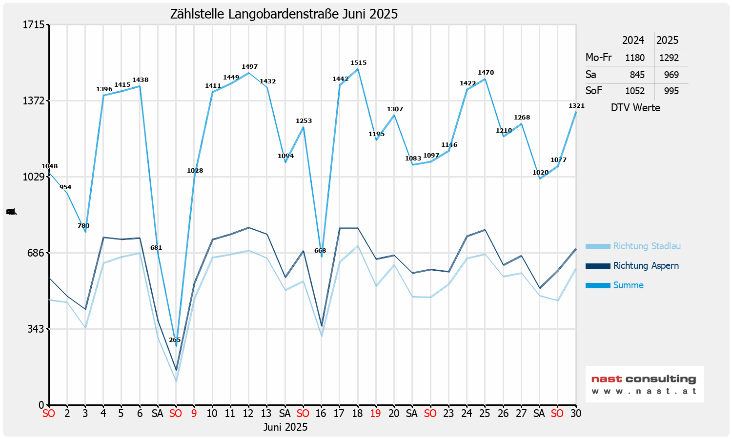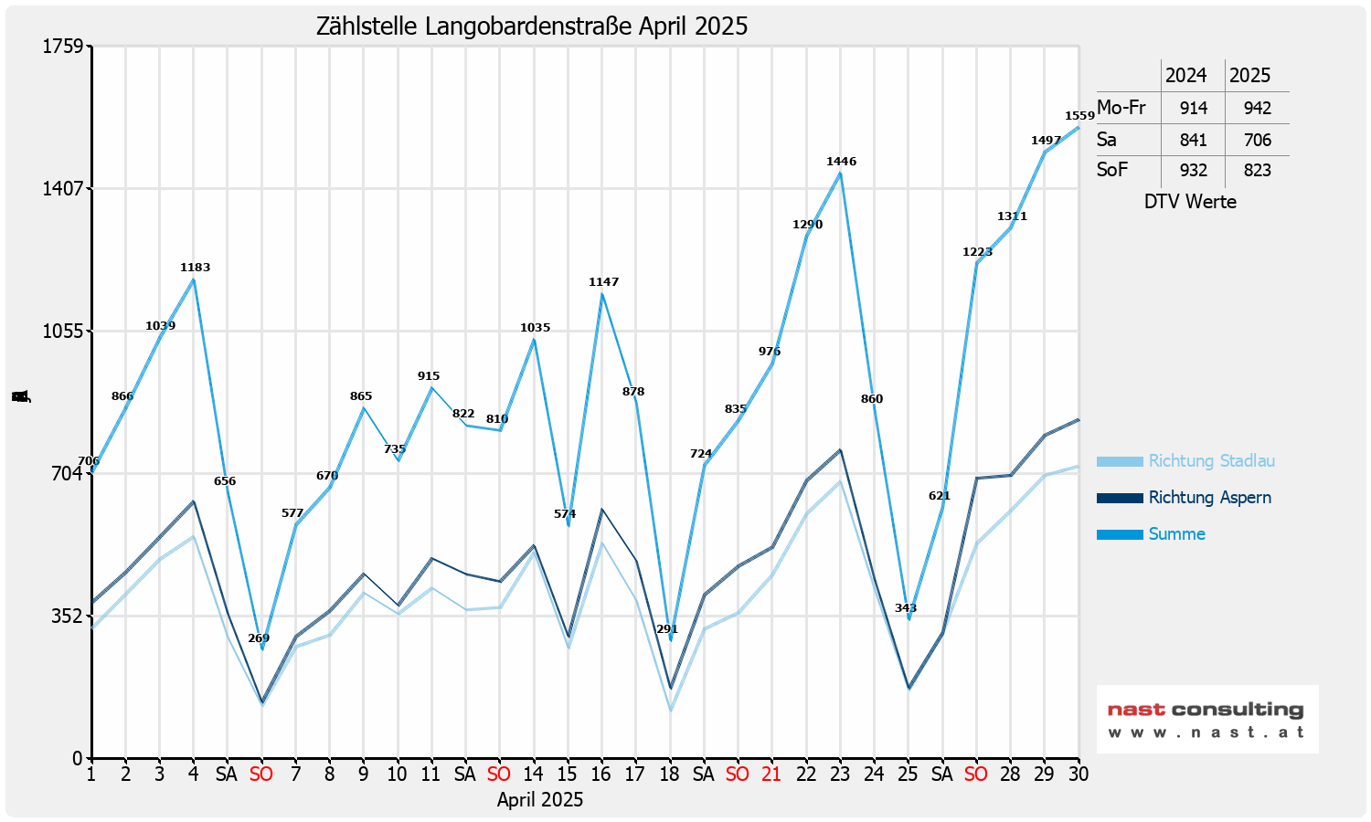 Im „Querschnitt Donau“ sind die Zählstellen Steinitzsteg, Friedrich-Engels-Platz, Maria-Resituta-Platz, Lassallestraße, Praterbrücke, Kraftwerk Freudenau inkludiert.