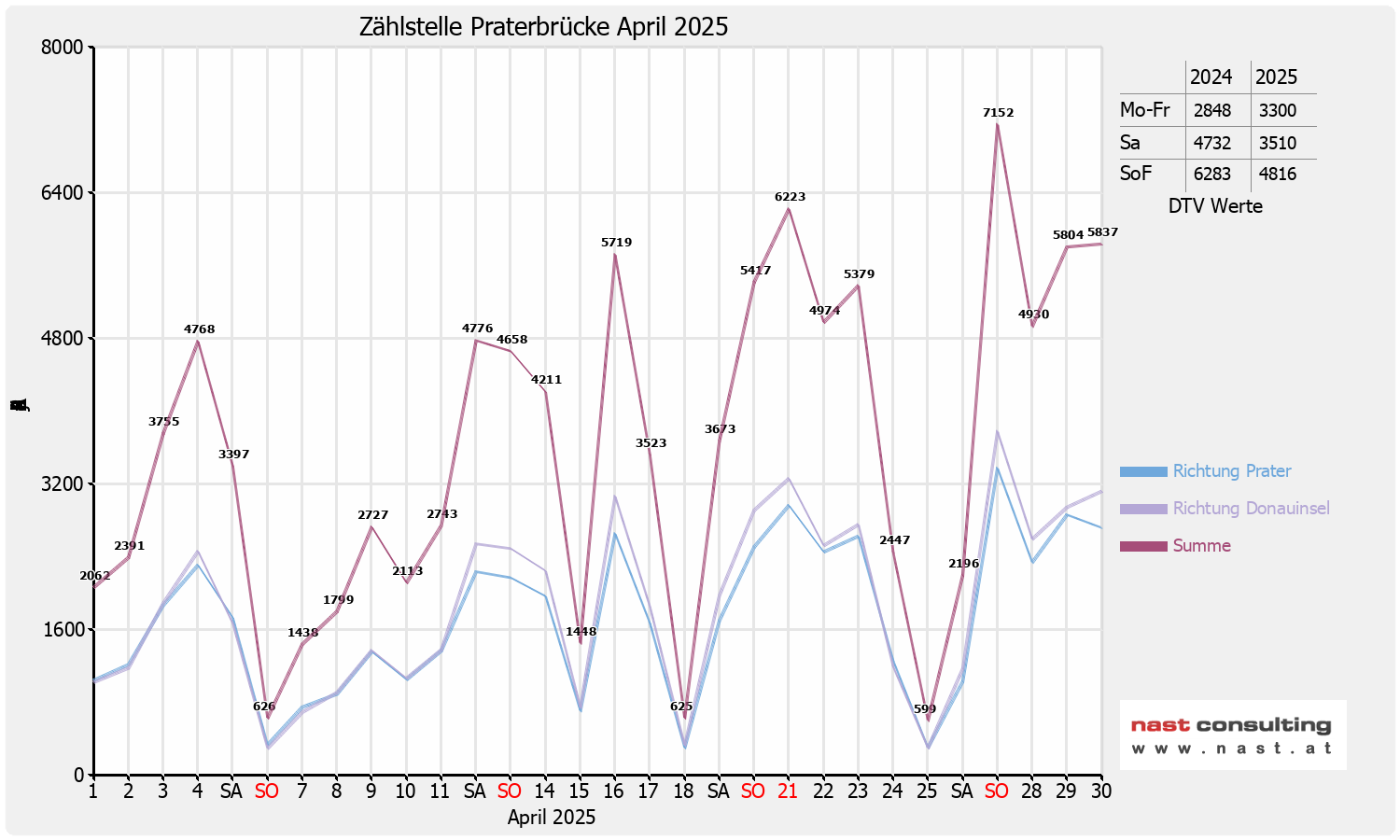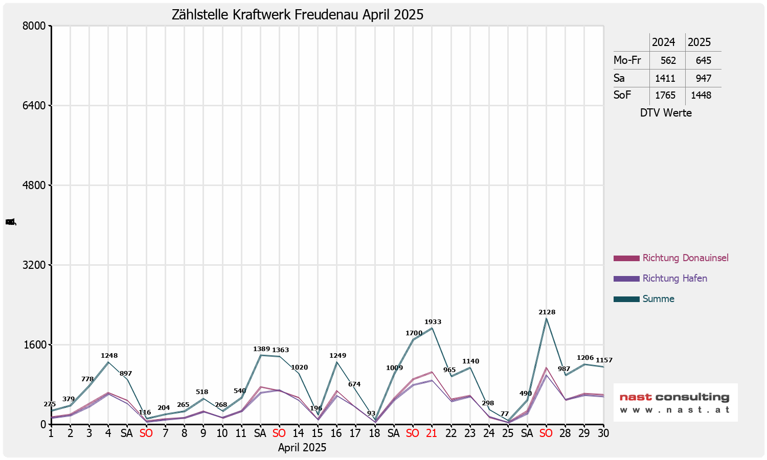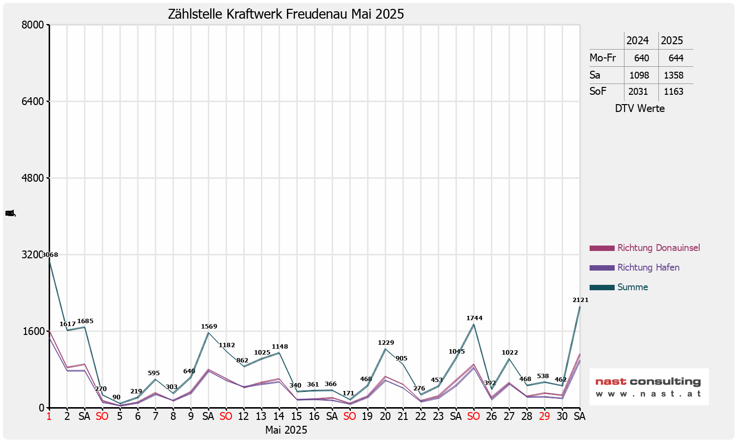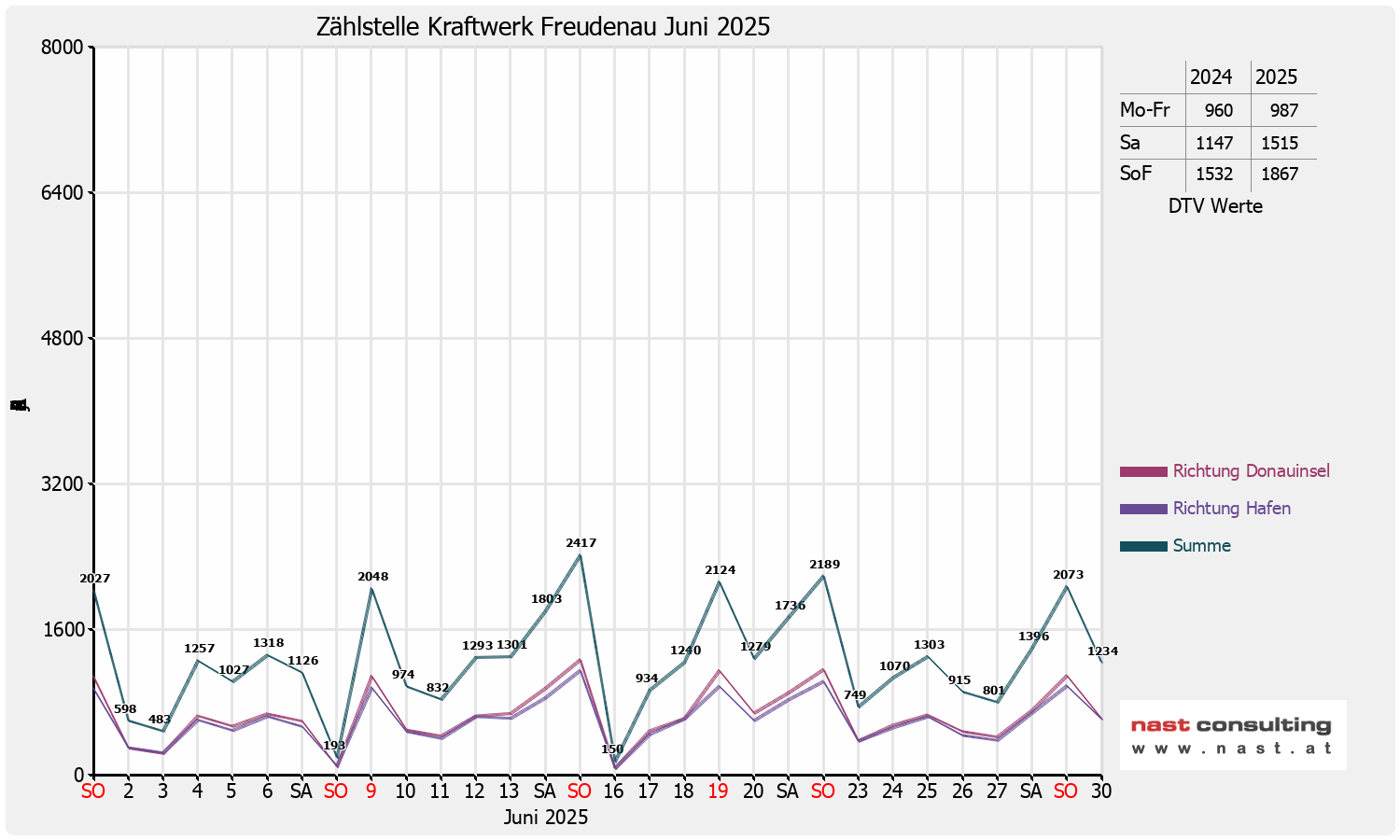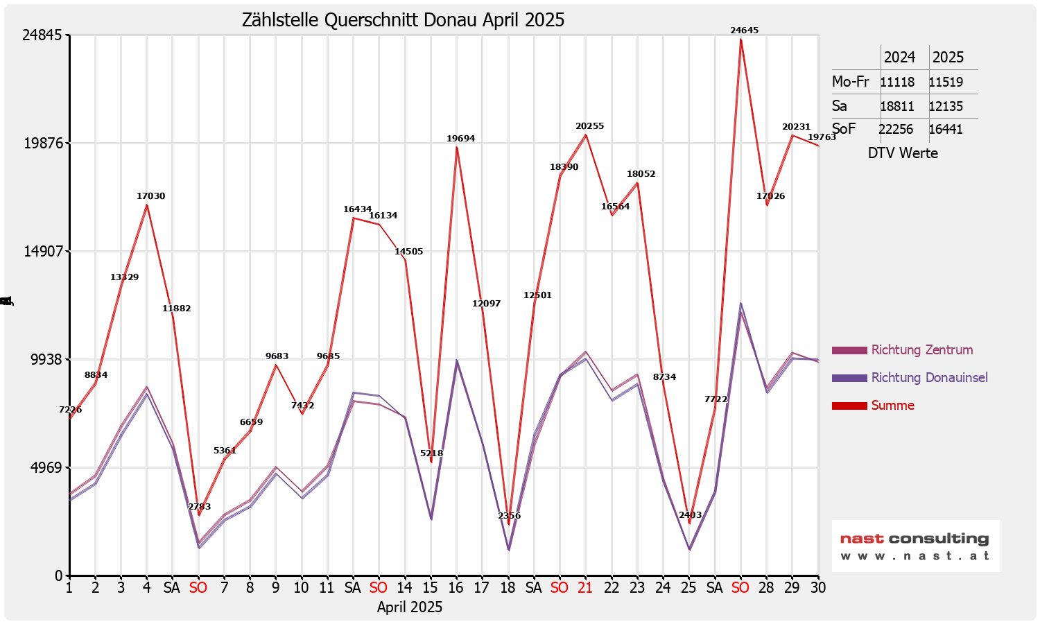Im „Querschnitt Donau“ sind die Zählstellen Steinitzsteg, Friedrich-Engels-Platz, Maria-Resituta-Platz, Lassallestraße, Praterbrücke, Kraftwerk Freudenau inkludiert.