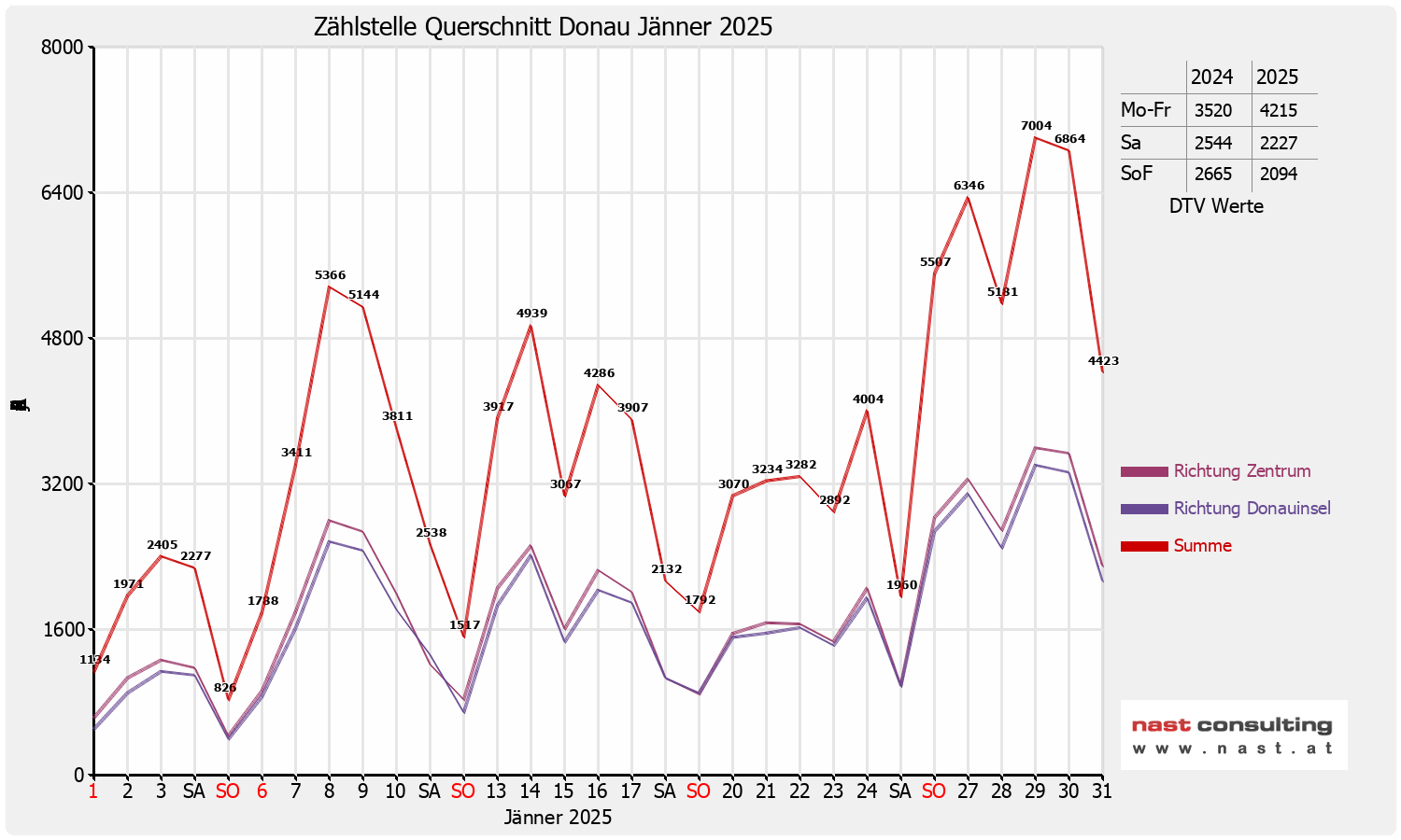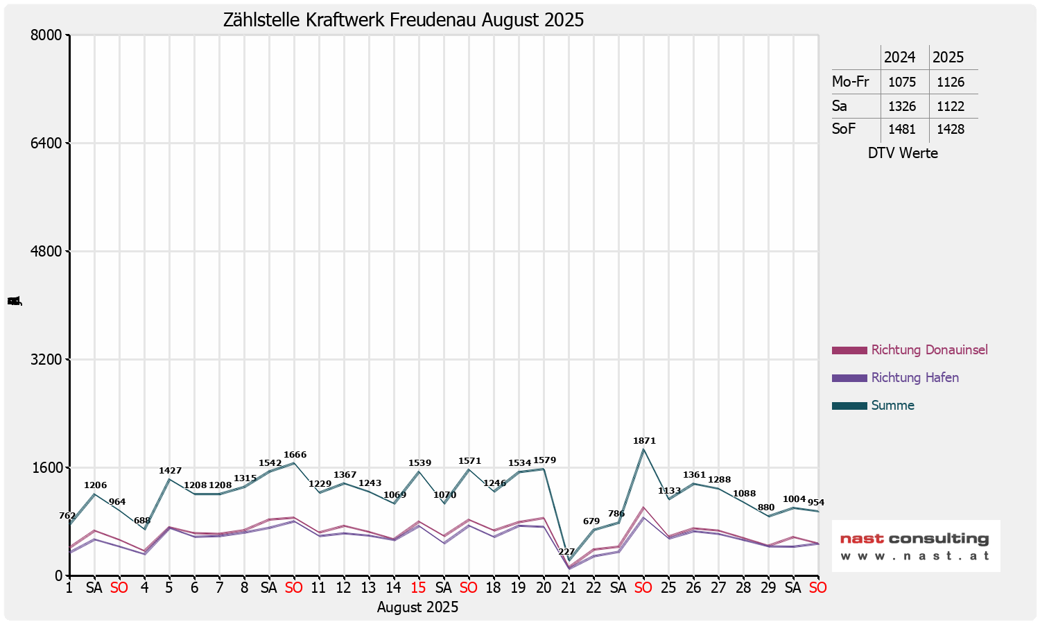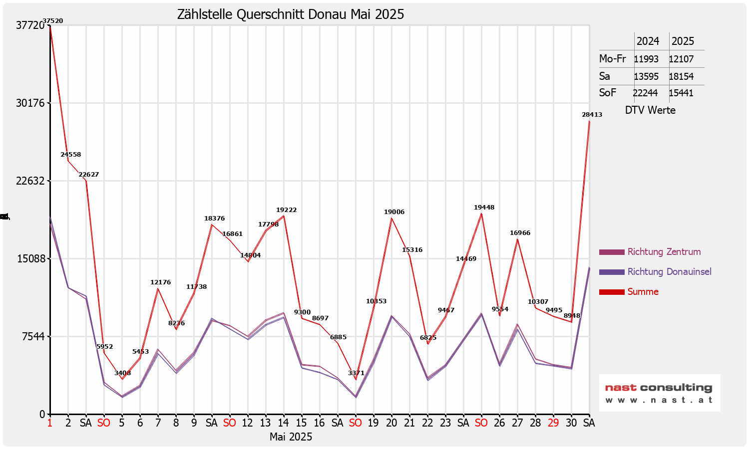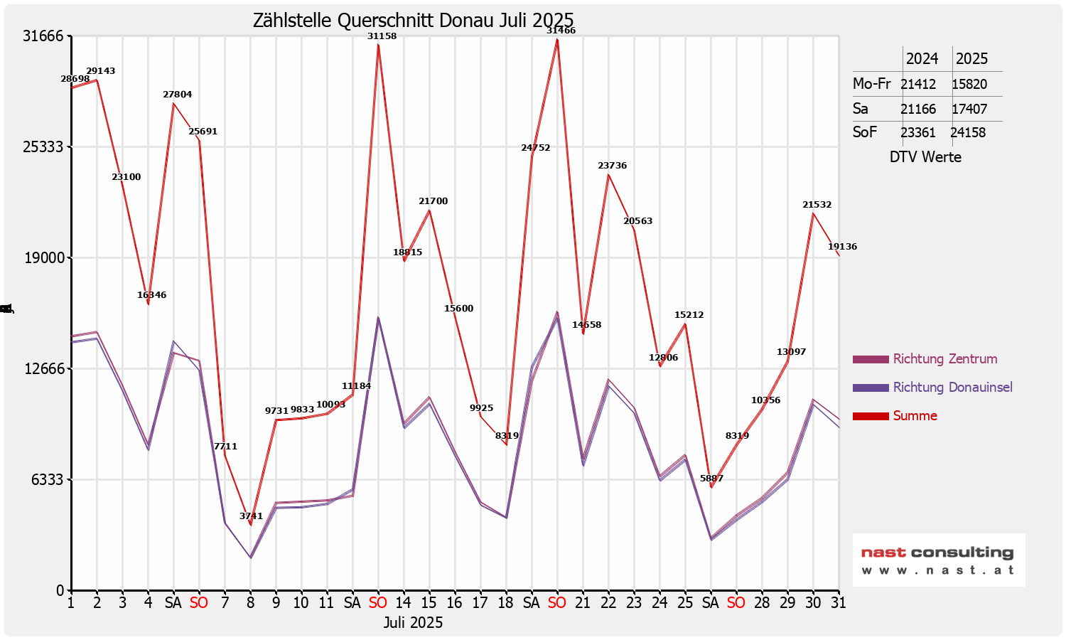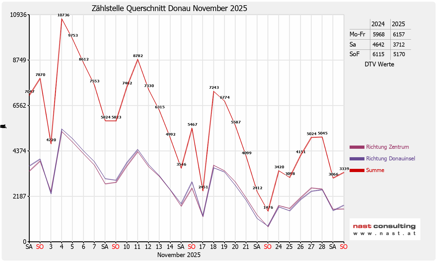 Im „Querschnitt Donau“ sind die Zählstellen Steinitzsteg, Friedrich-Engels-Platz, Maria-Resituta-Platz, Lassallestraße, Praterbrücke, Kraftwerk Freudenau inkludiert.