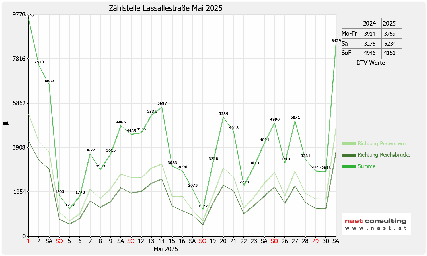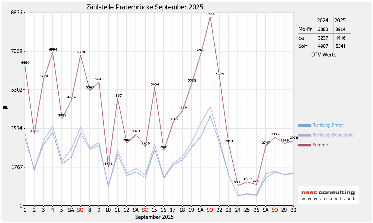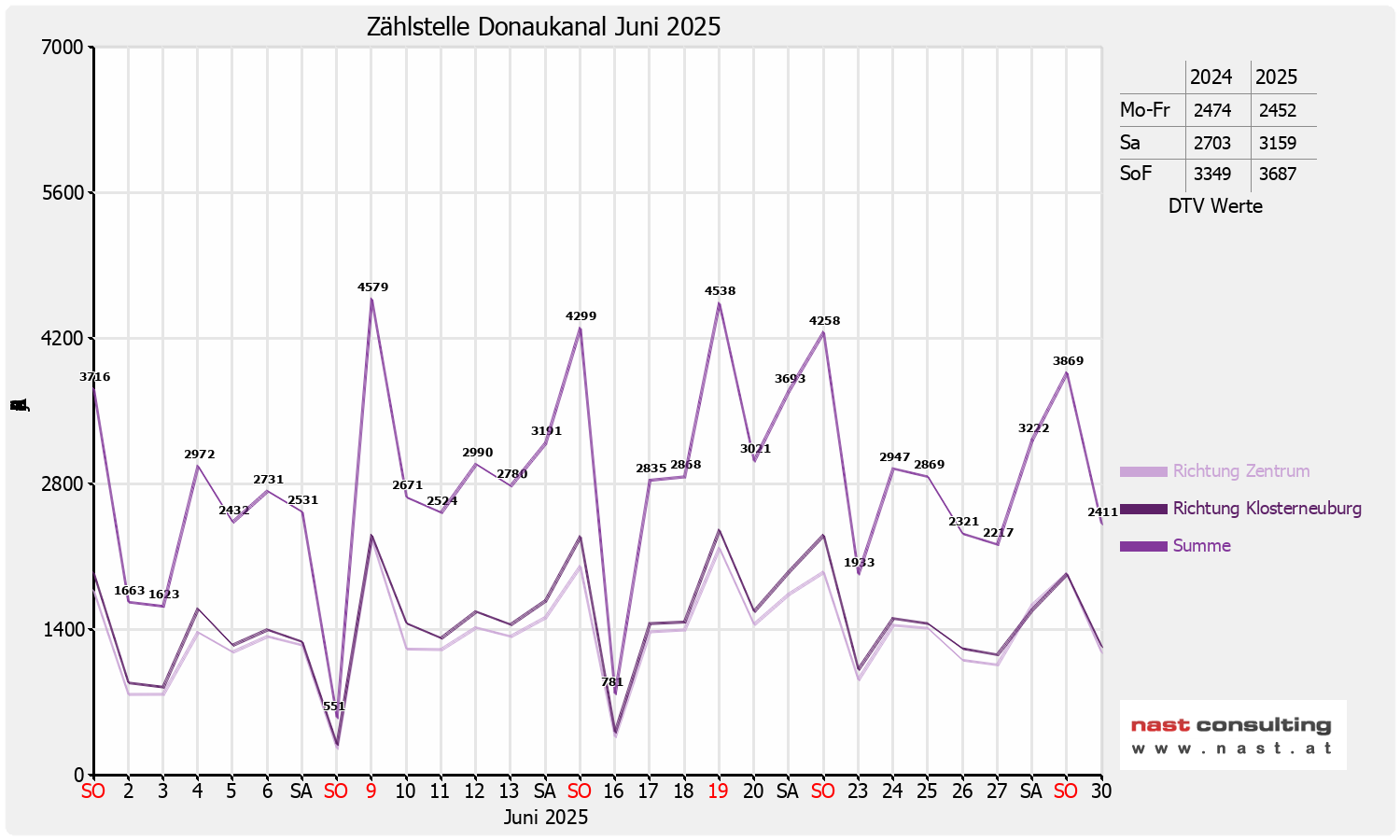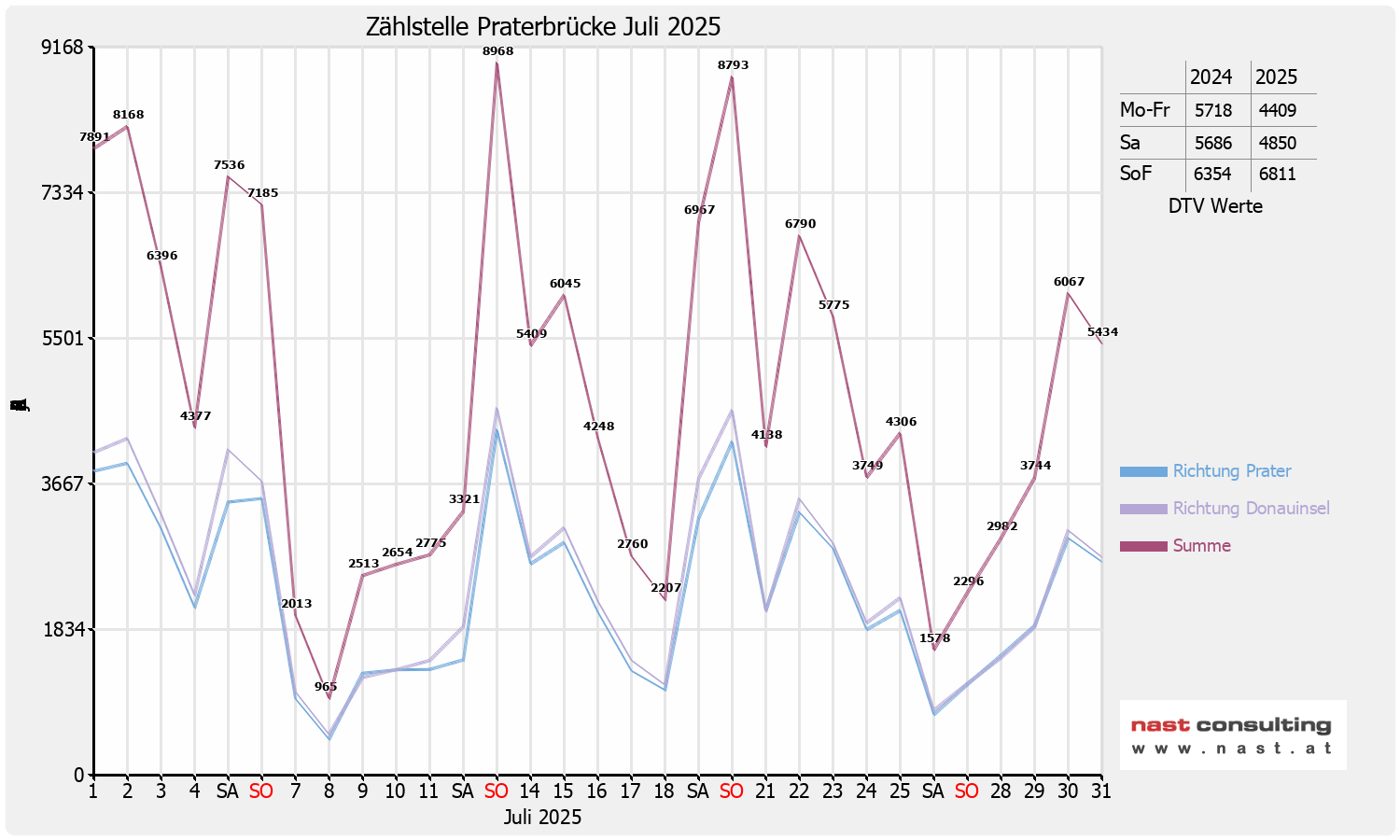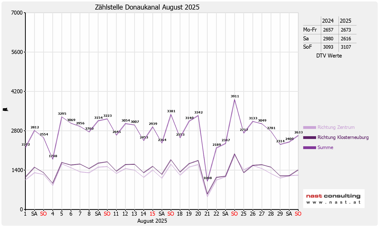 Im „Querschnitt Donau“ sind die Zählstellen Steinitzsteg, Friedrich-Engels-Platz, Maria-Resituta-Platz, Lassallestraße, Praterbrücke, Kraftwerk Freudenau inkludiert.
