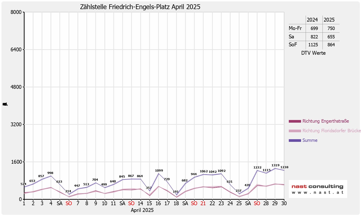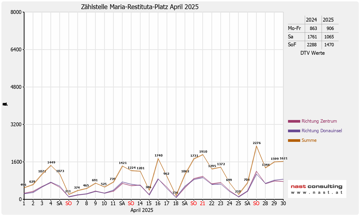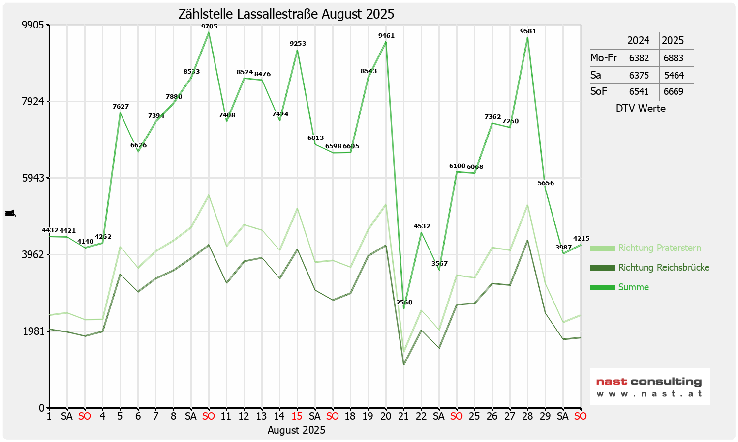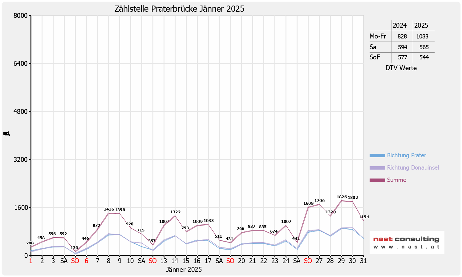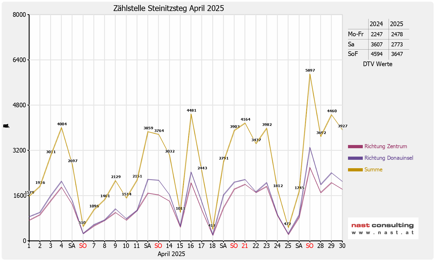 Im „Querschnitt Donau“ sind die Zählstellen Steinitzsteg, Friedrich-Engels-Platz, Maria-Resituta-Platz, Lassallestraße, Praterbrücke, Kraftwerk Freudenau inkludiert.