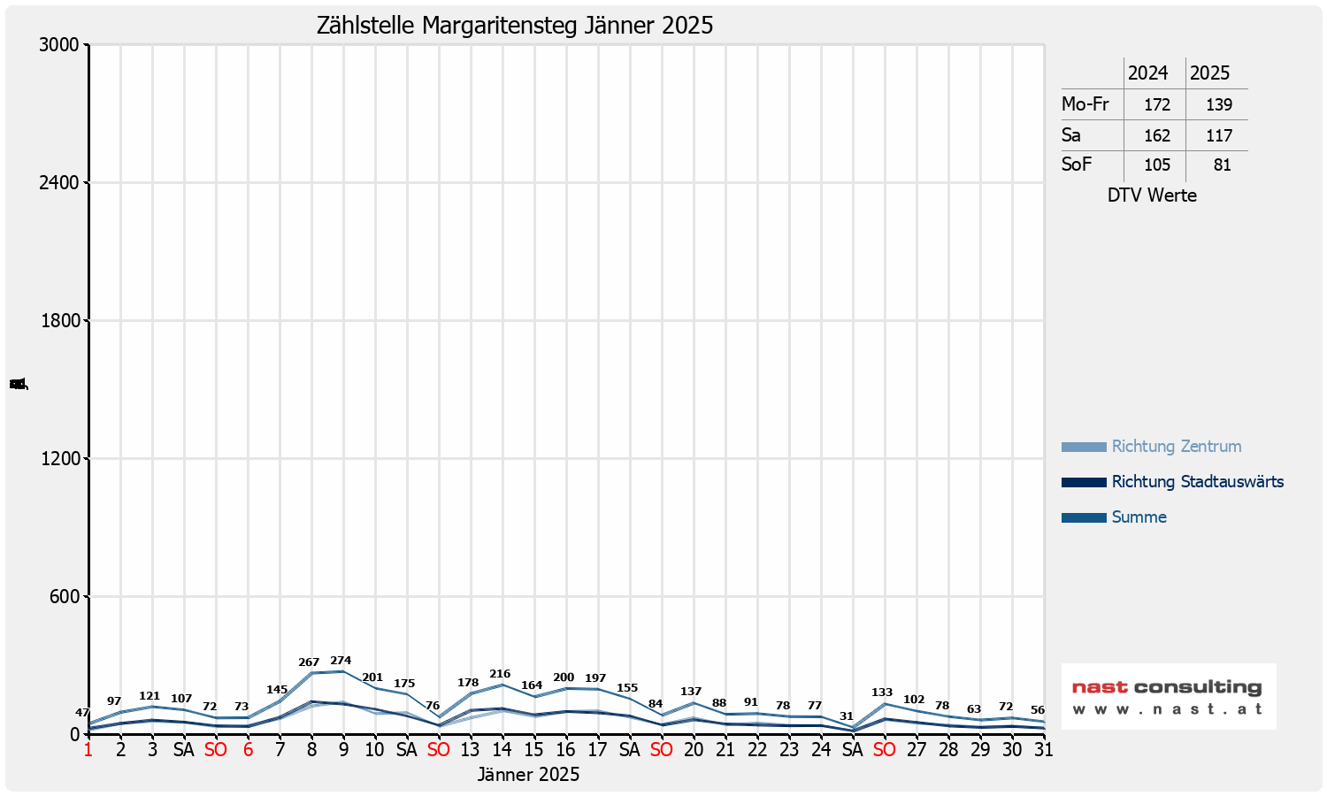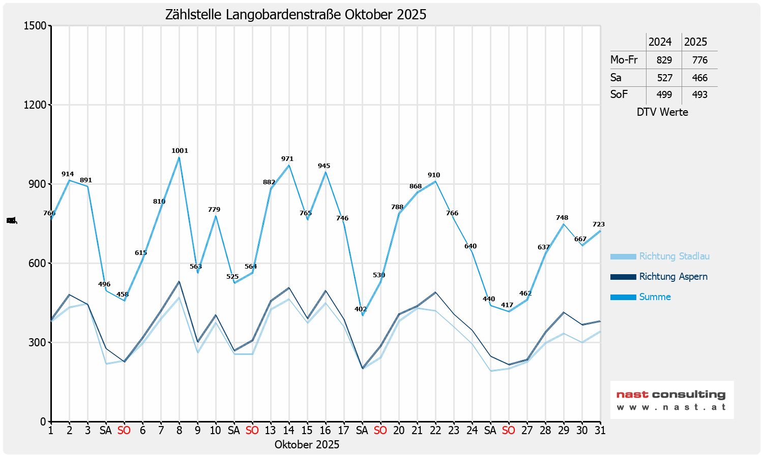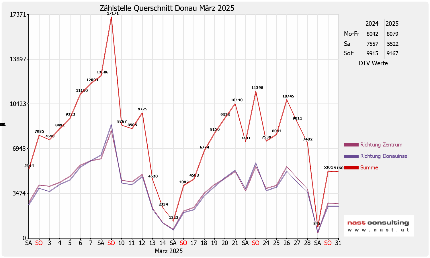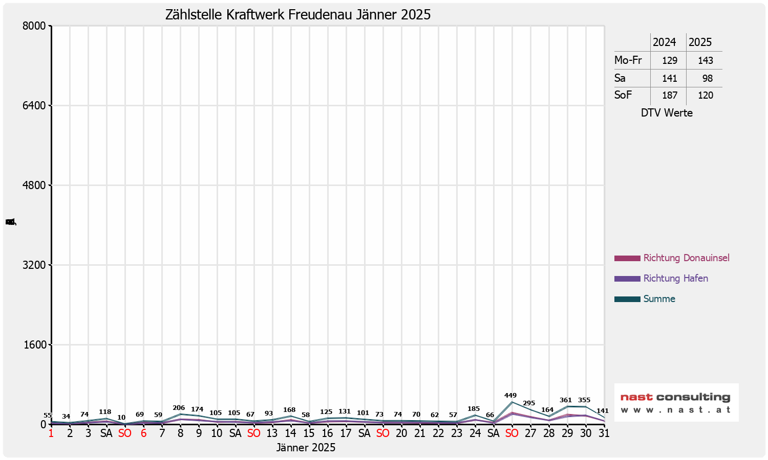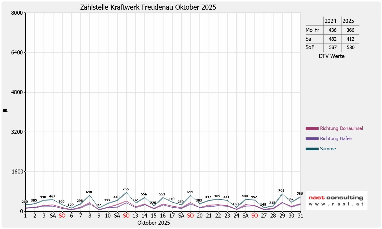Im „Querschnitt Donau“ sind die Zählstellen Steinitzsteg, Friedrich-Engels-Platz, Maria-Resituta-Platz, Lassallestraße, Praterbrücke, Kraftwerk Freudenau inkludiert.