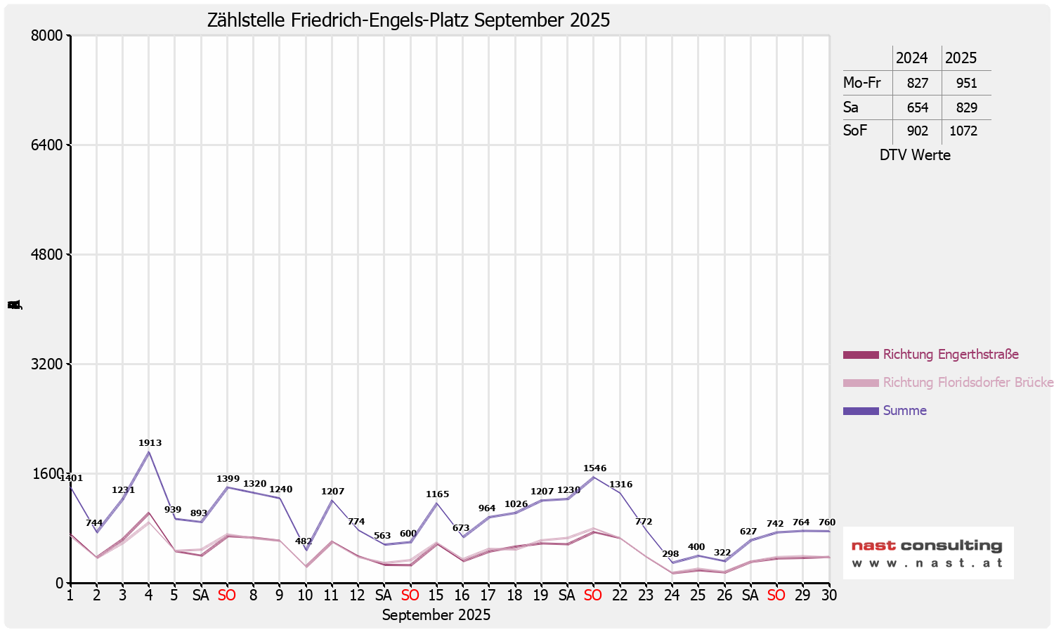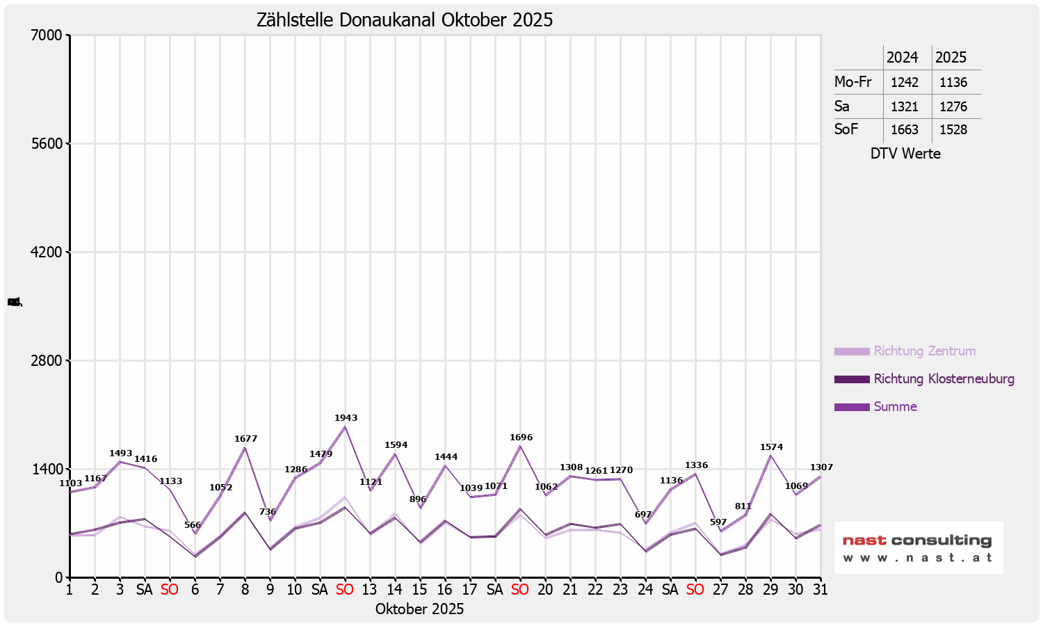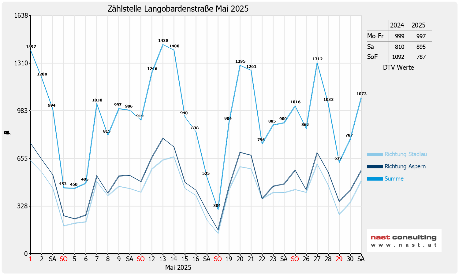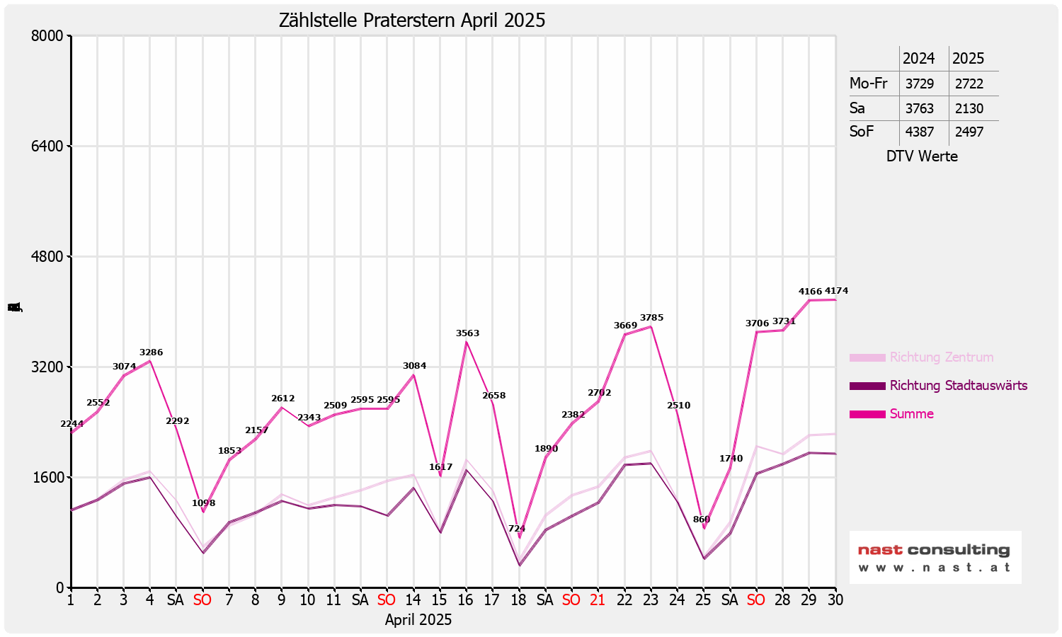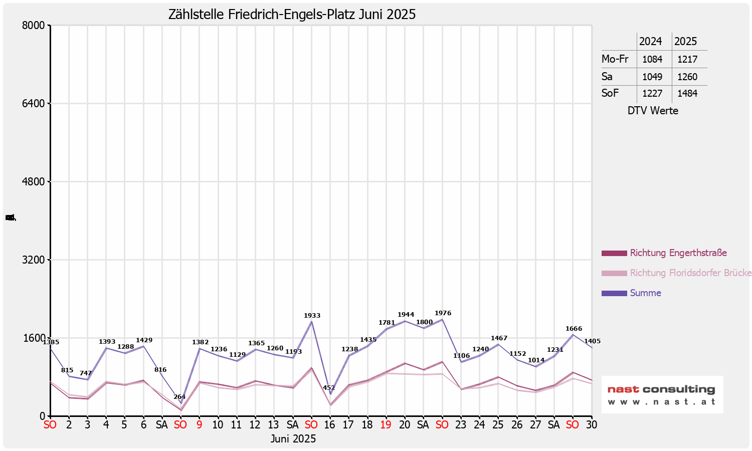 Im „Querschnitt Donau“ sind die Zählstellen Steinitzsteg, Friedrich-Engels-Platz, Maria-Resituta-Platz, Lassallestraße, Praterbrücke, Kraftwerk Freudenau inkludiert.
