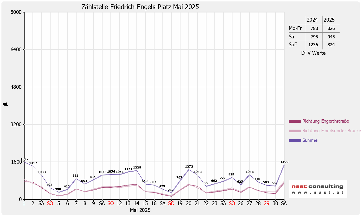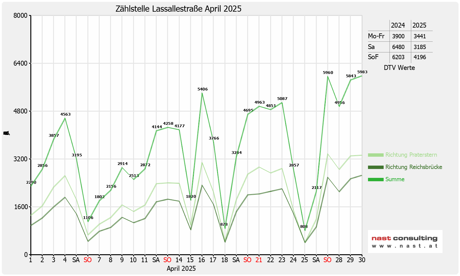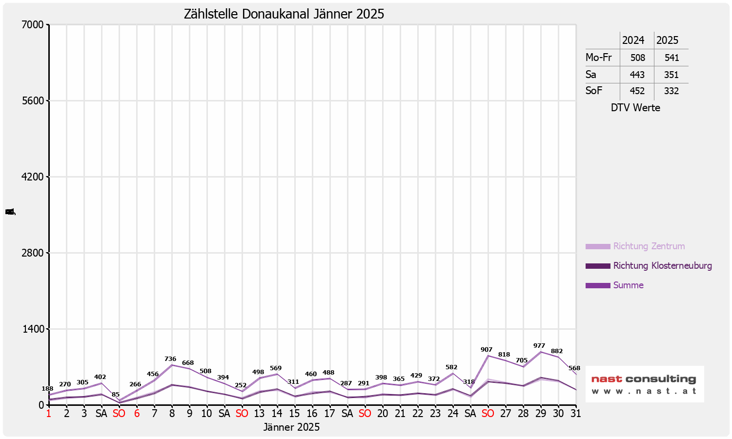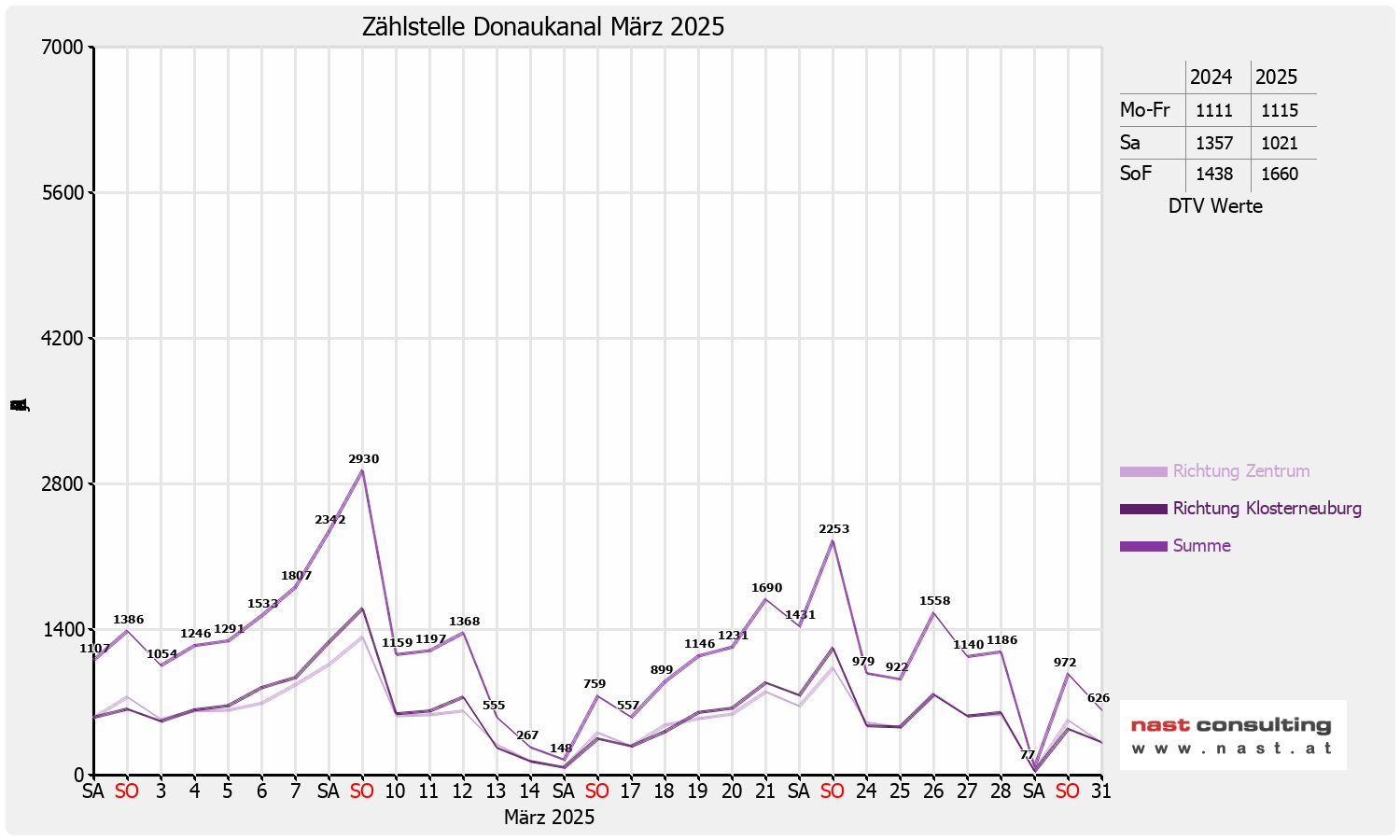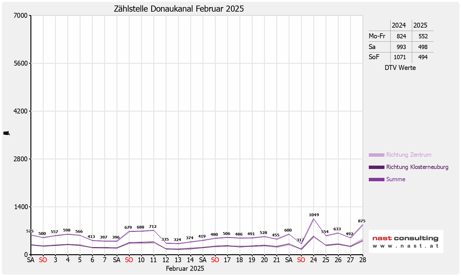Im „Querschnitt Donau“ sind die Zählstellen Steinitzsteg, Friedrich-Engels-Platz, Maria-Resituta-Platz, Lassallestraße, Praterbrücke, Kraftwerk Freudenau inkludiert.