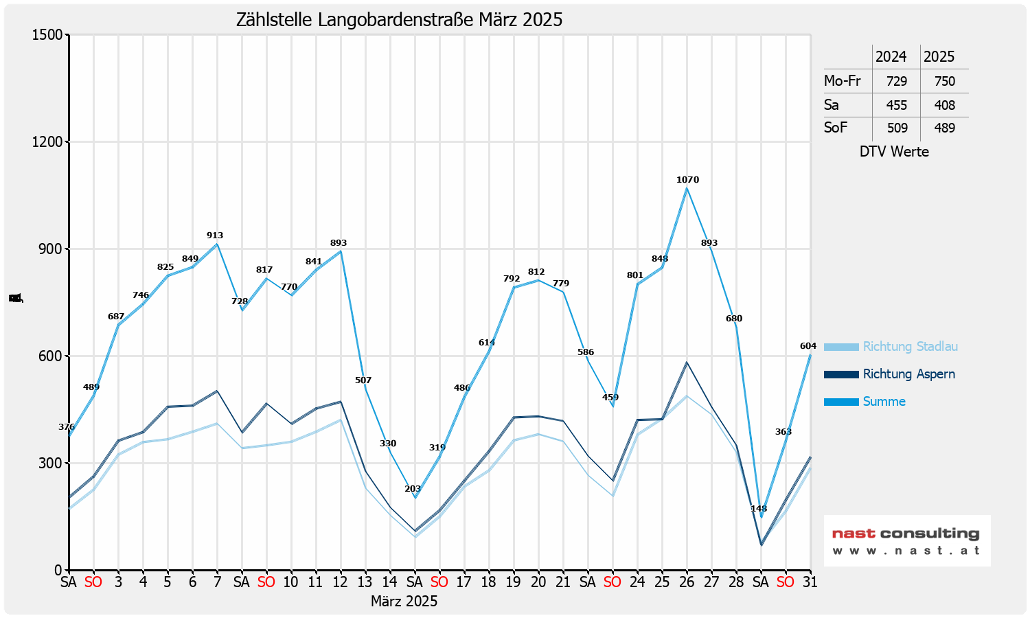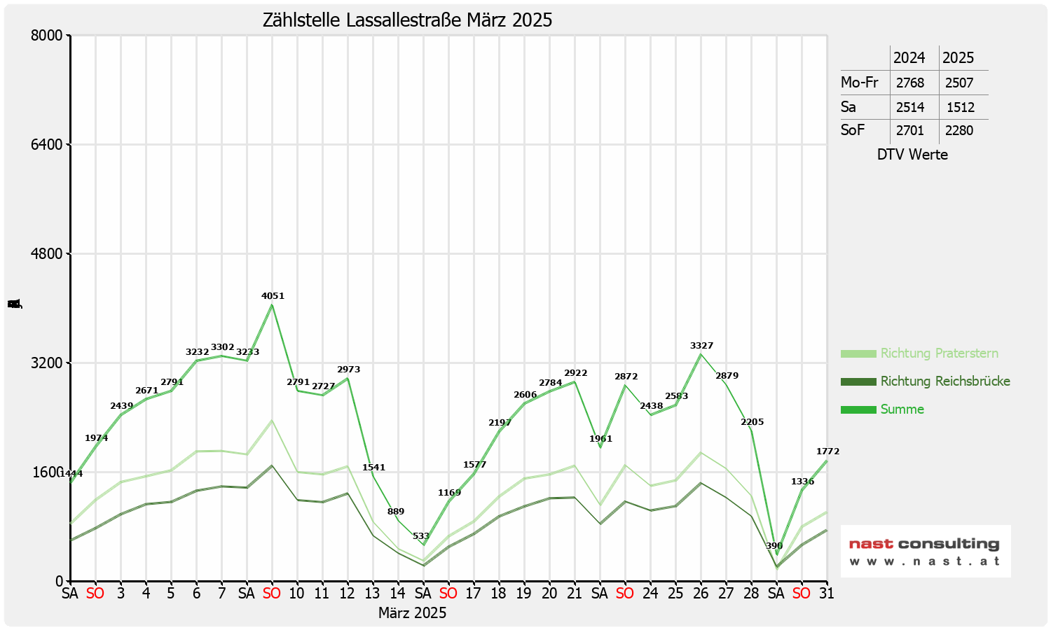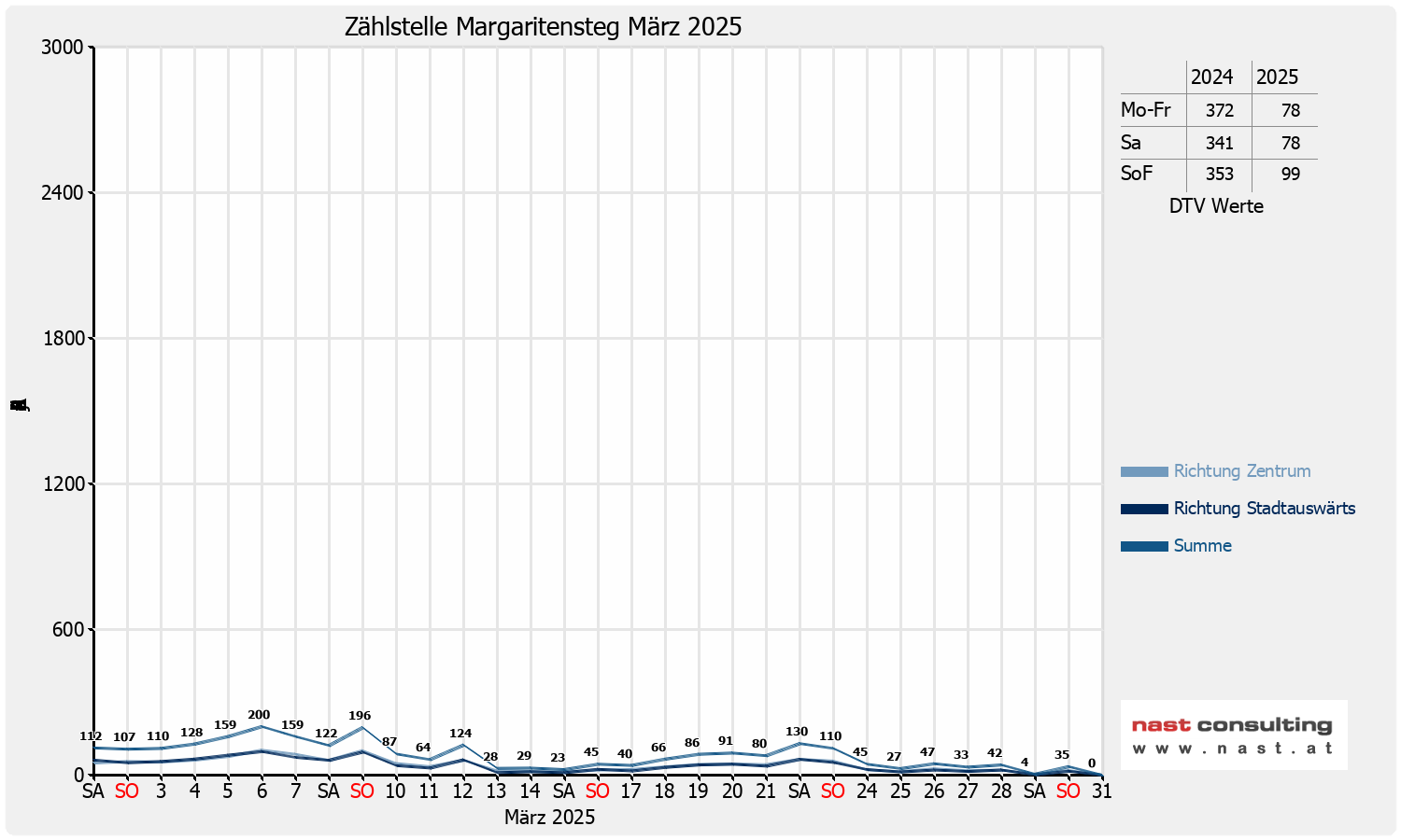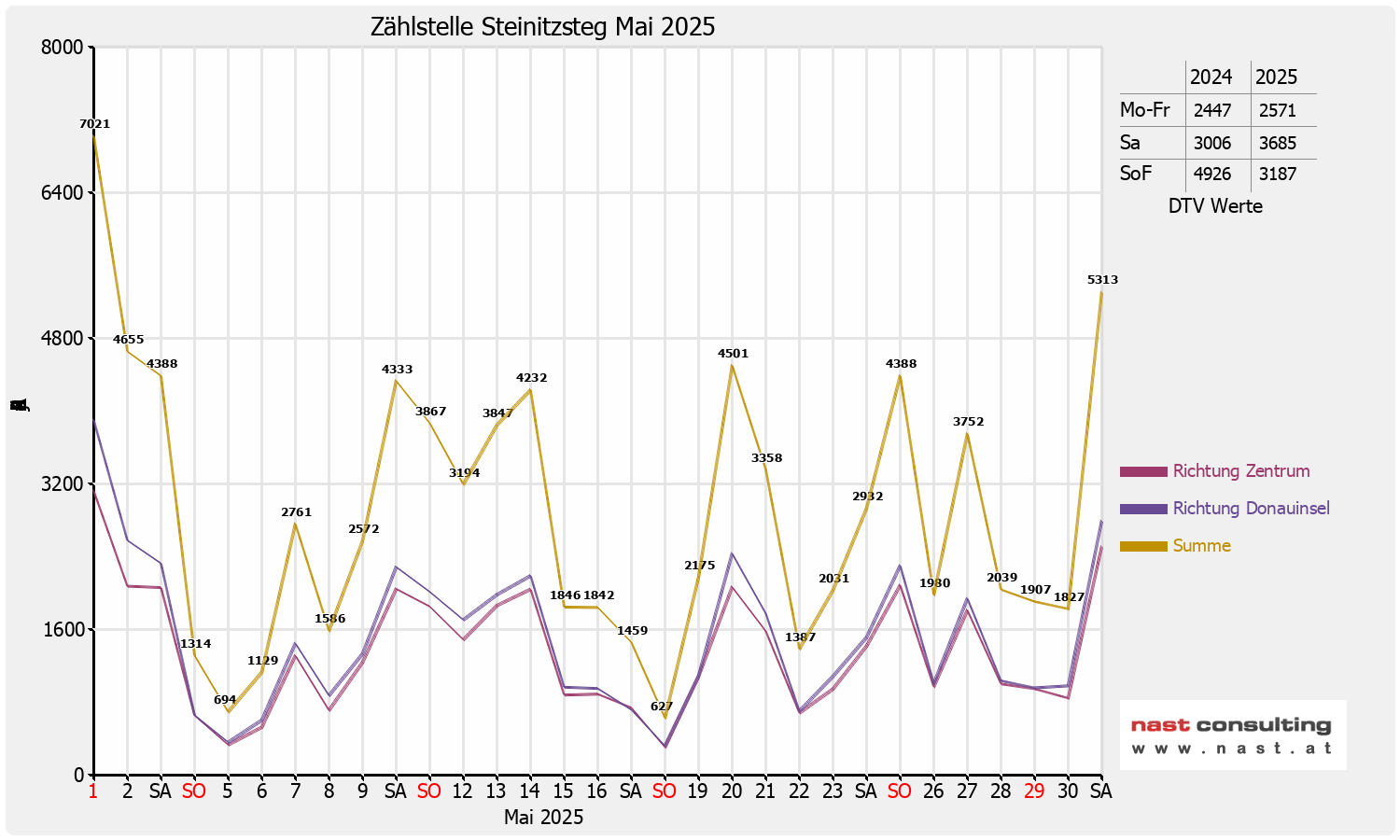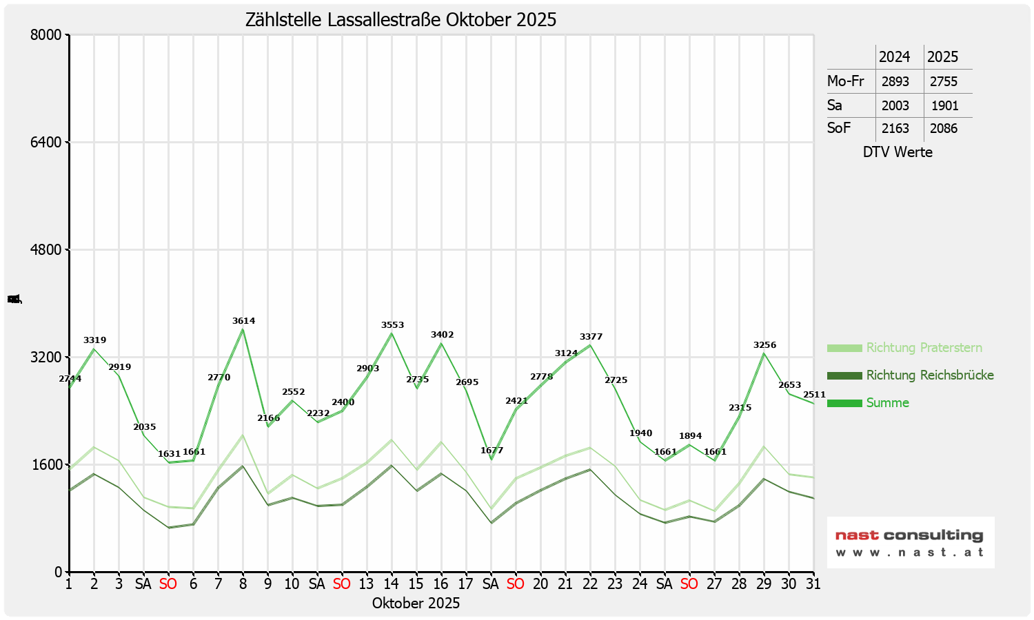Im „Querschnitt Donau“ sind die Zählstellen Steinitzsteg, Friedrich-Engels-Platz, Maria-Resituta-Platz, Lassallestraße, Praterbrücke, Kraftwerk Freudenau inkludiert.