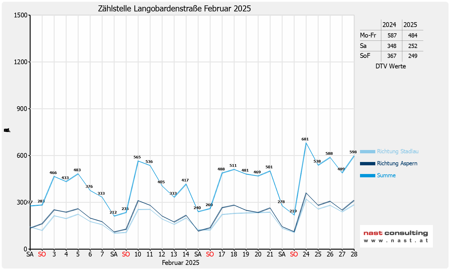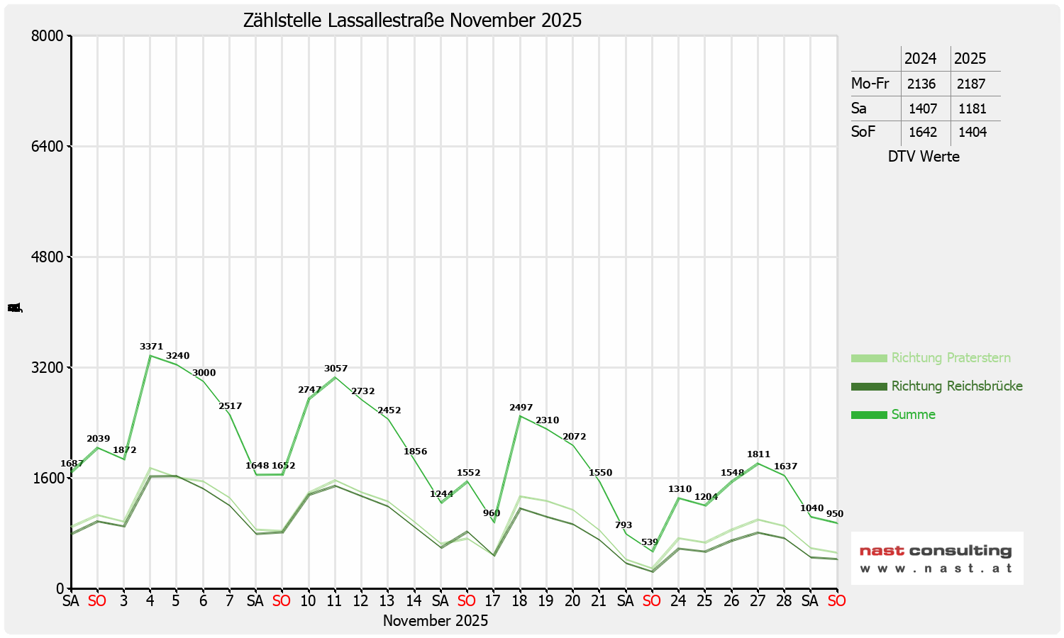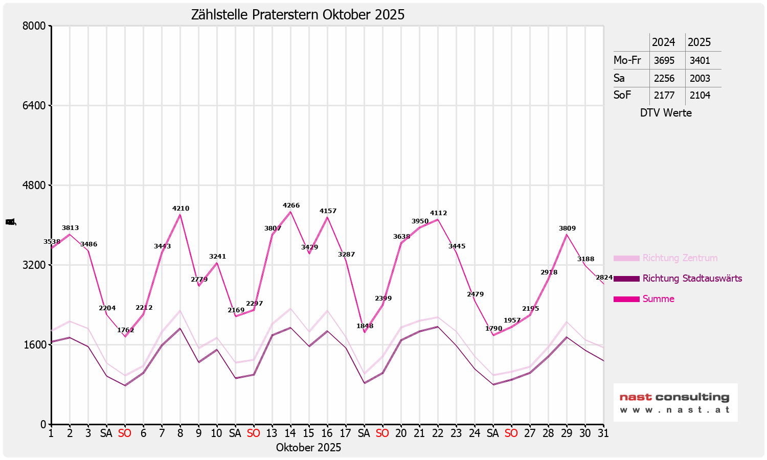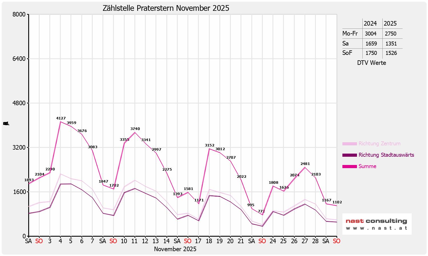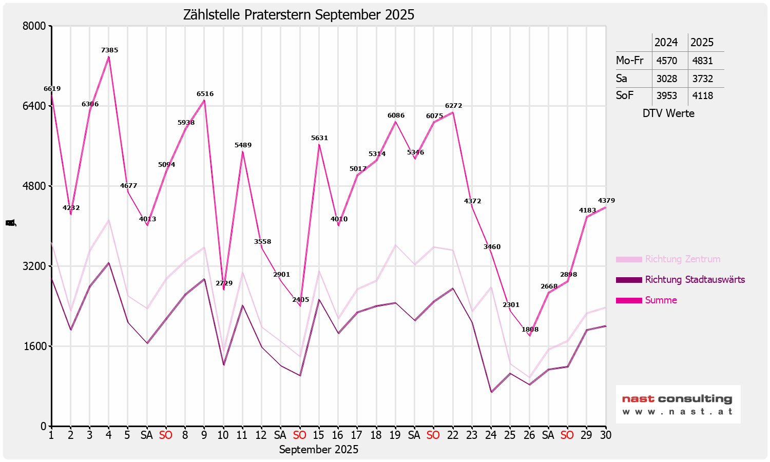 Im „Querschnitt Donau“ sind die Zählstellen Steinitzsteg, Friedrich-Engels-Platz, Maria-Resituta-Platz, Lassallestraße, Praterbrücke, Kraftwerk Freudenau inkludiert.