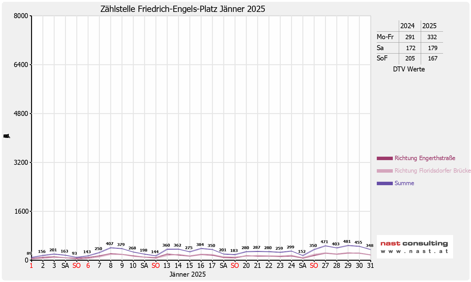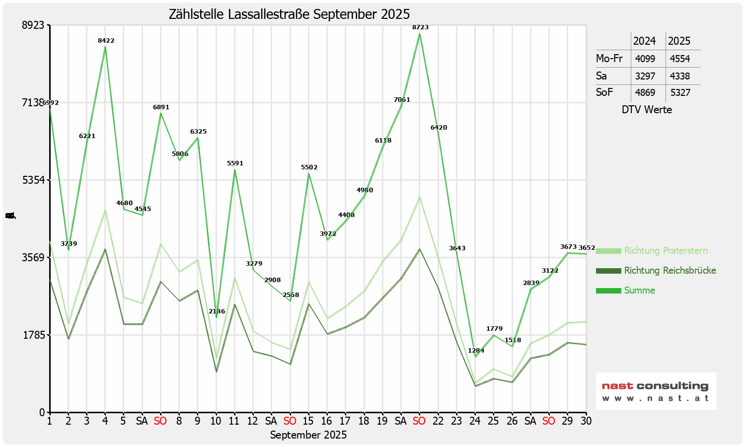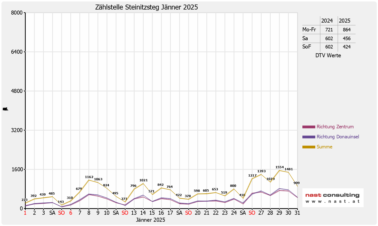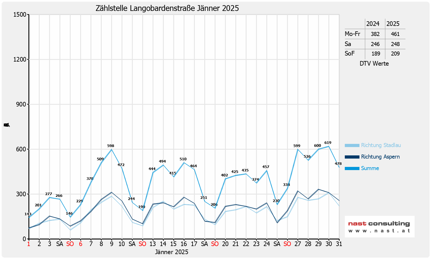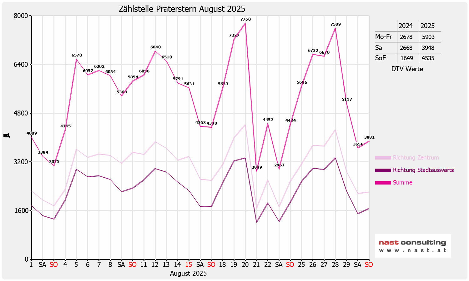 Im „Querschnitt Donau“ sind die Zählstellen Steinitzsteg, Friedrich-Engels-Platz, Maria-Resituta-Platz, Lassallestraße, Praterbrücke, Kraftwerk Freudenau inkludiert.