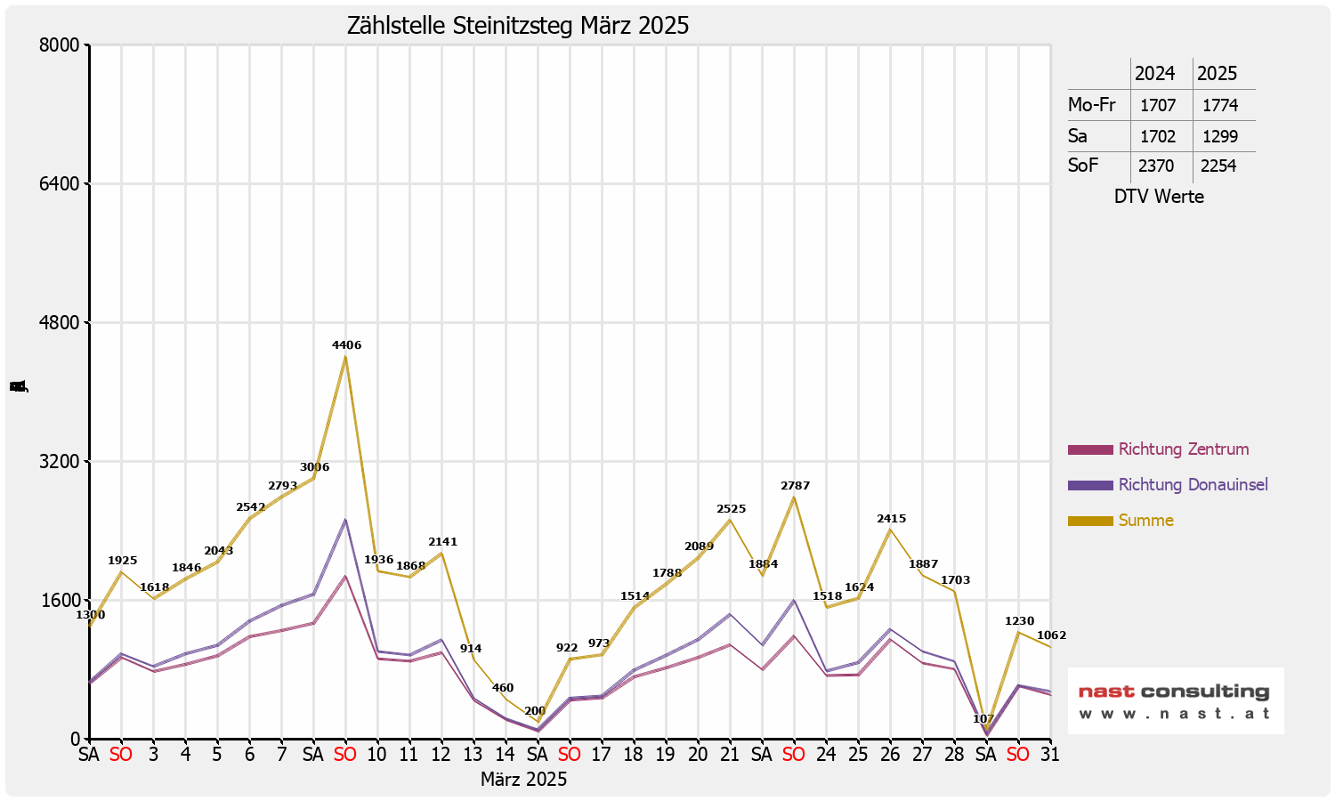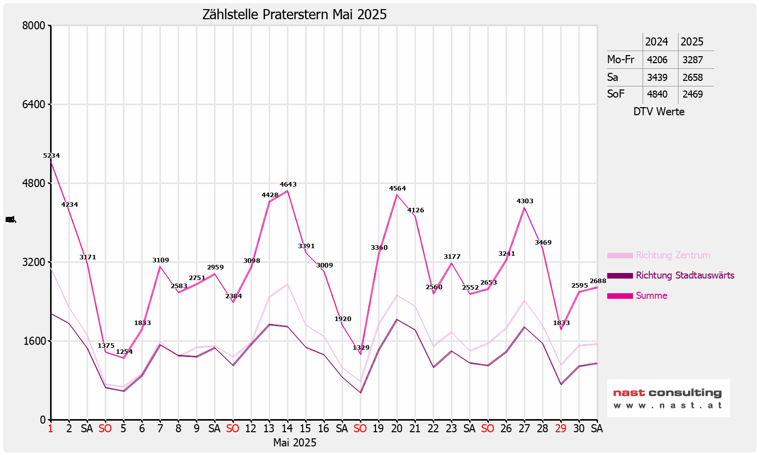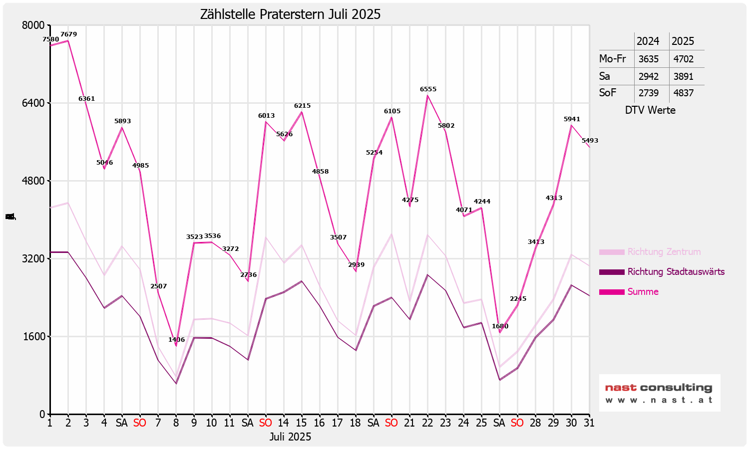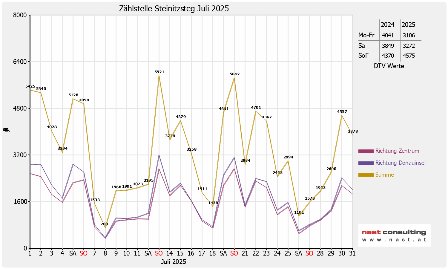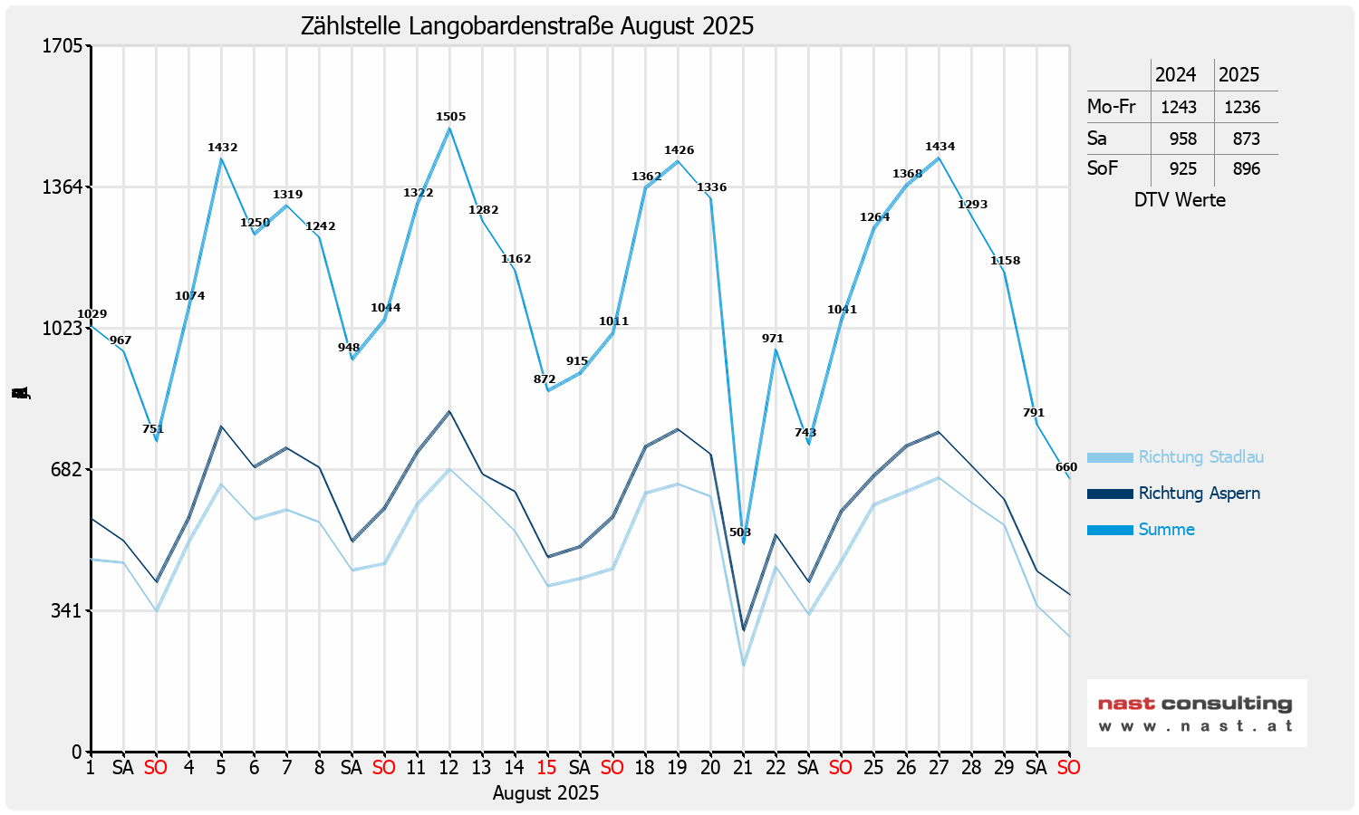 Im „Querschnitt Donau“ sind die Zählstellen Steinitzsteg, Friedrich-Engels-Platz, Maria-Resituta-Platz, Lassallestraße, Praterbrücke, Kraftwerk Freudenau inkludiert.