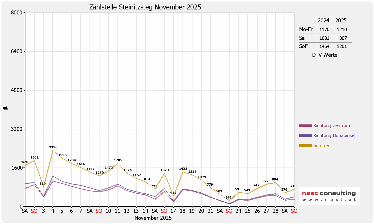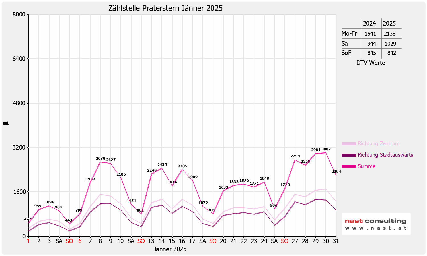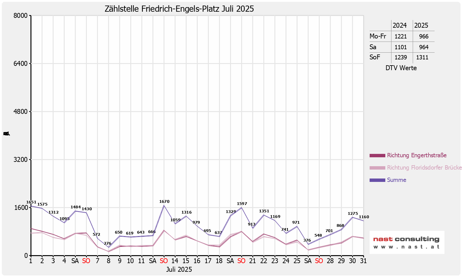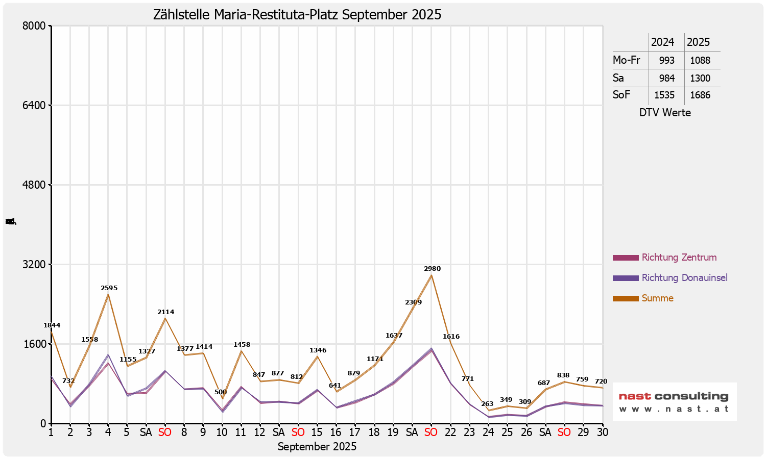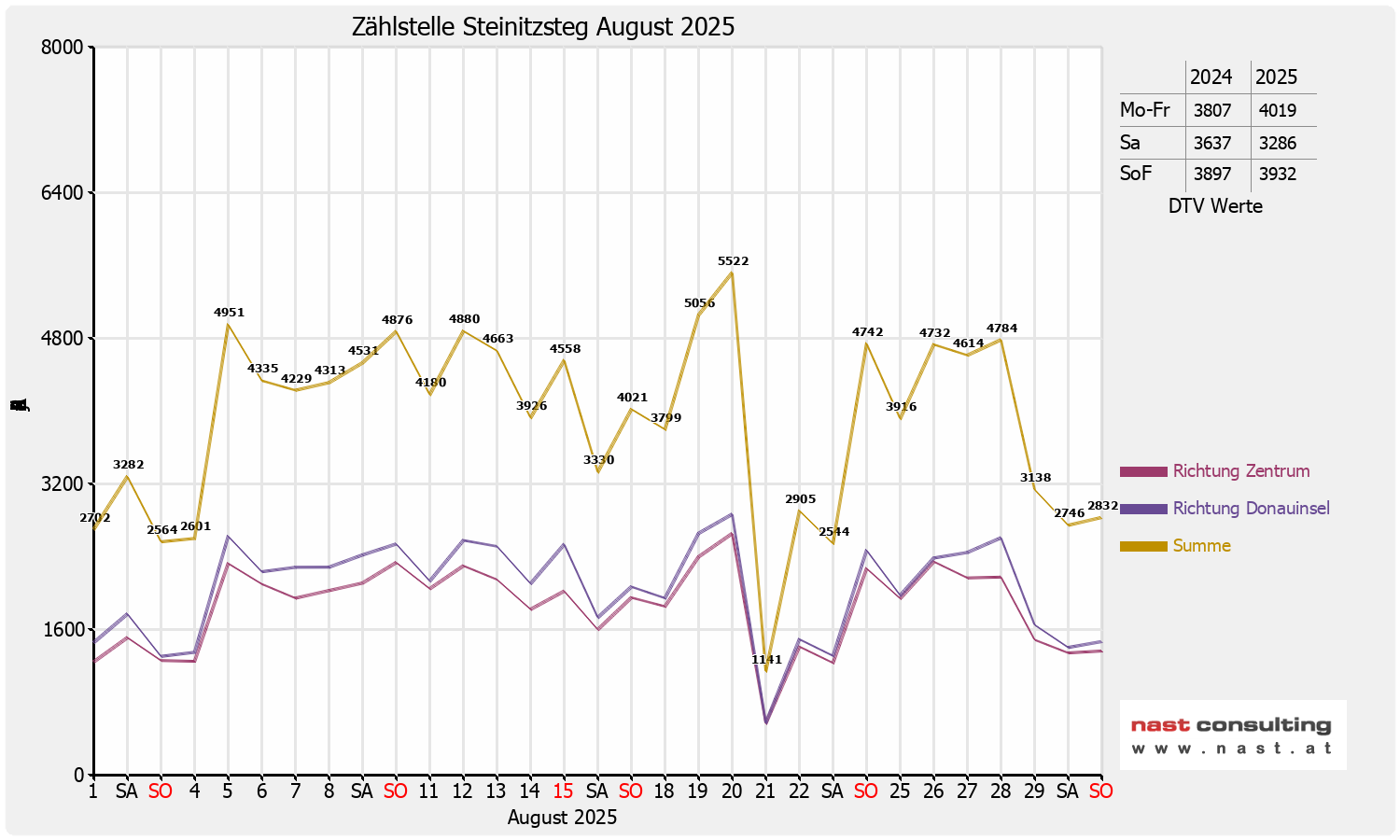 Im „Querschnitt Donau“ sind die Zählstellen Steinitzsteg, Friedrich-Engels-Platz, Maria-Resituta-Platz, Lassallestraße, Praterbrücke, Kraftwerk Freudenau inkludiert.